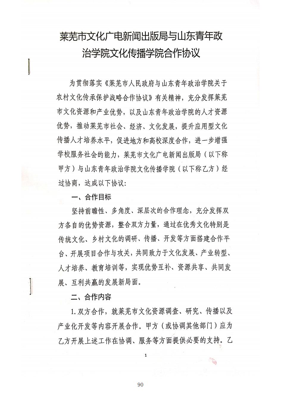 莱芜市文化广电新闻出版局与山青院文化传播学院合作协议