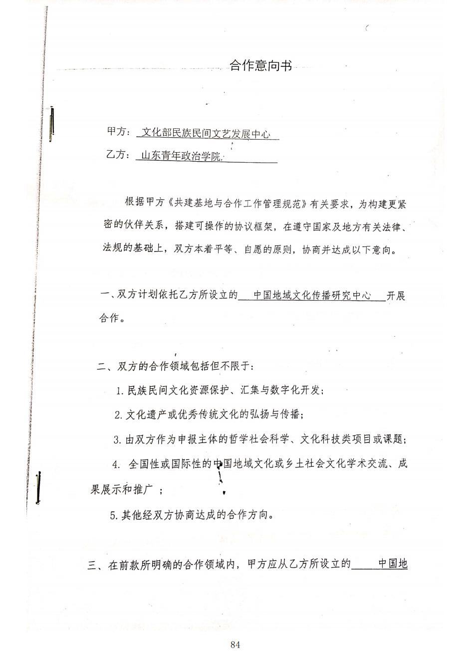 文化部民族民间文艺发展中心与山东青年政治学院共建中国地域文化传播研究中心合作意向书