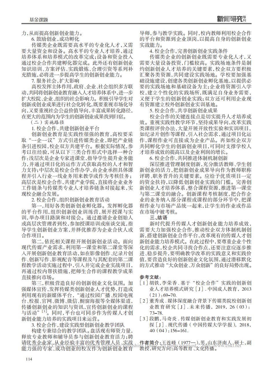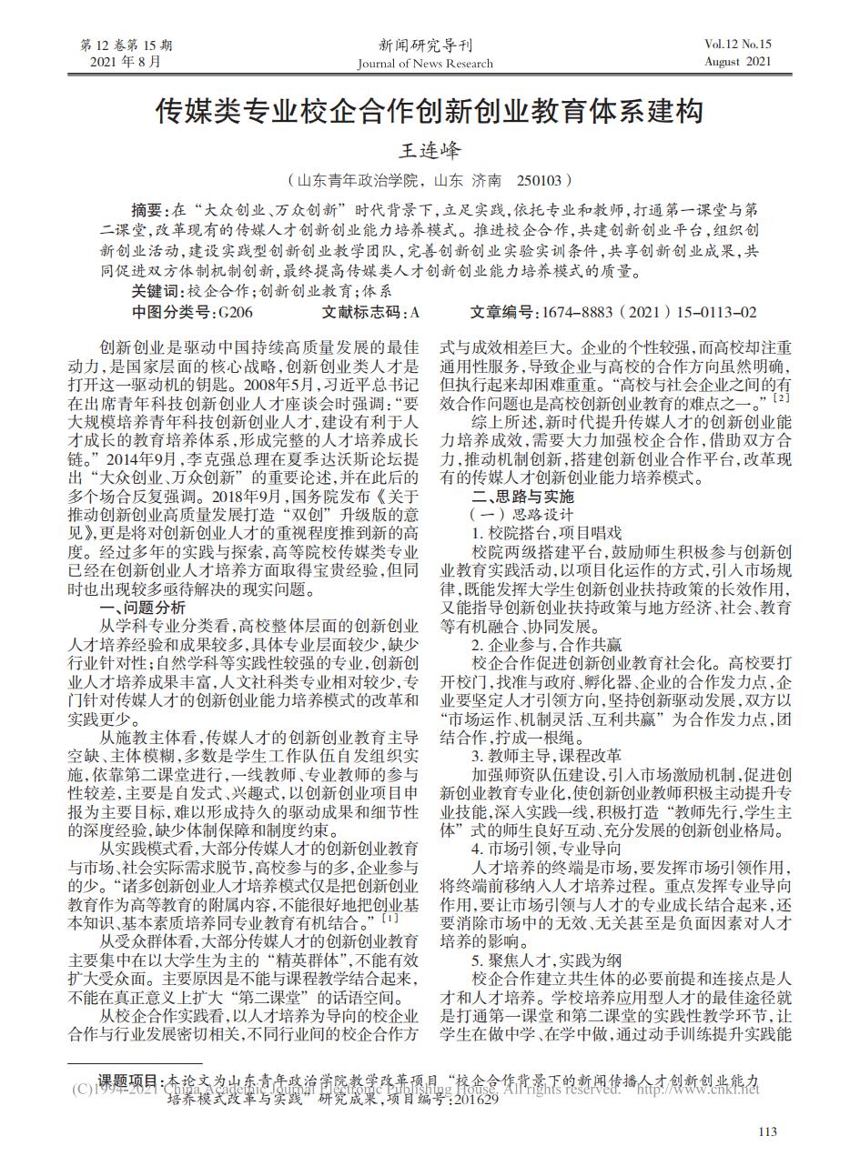 论文:《传媒类专业校企合作创新创业教育体系建构》