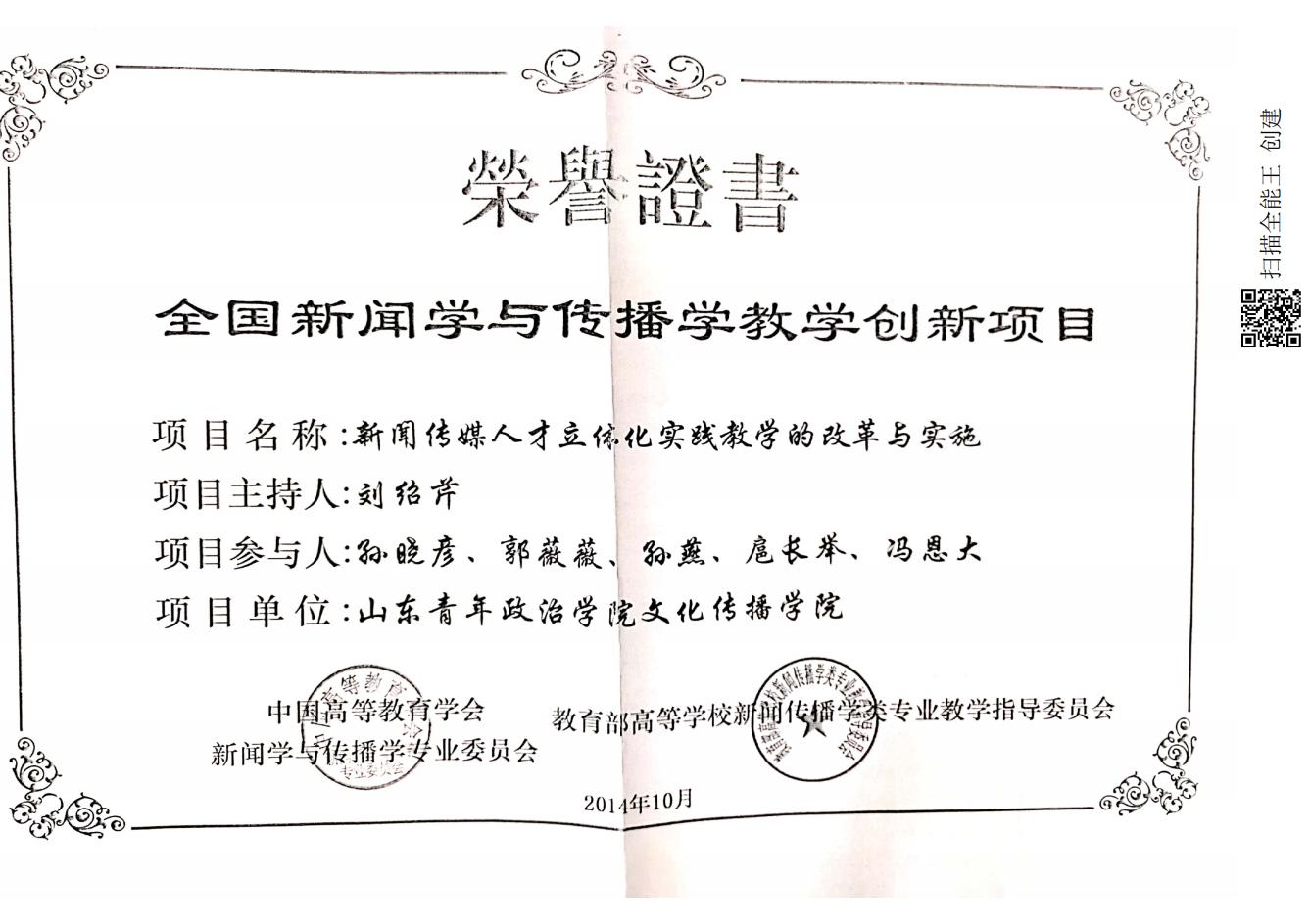 《新闻传媒人才立体化实践教学的改革与实施》获全国新闻学与传播学教学创新项目
