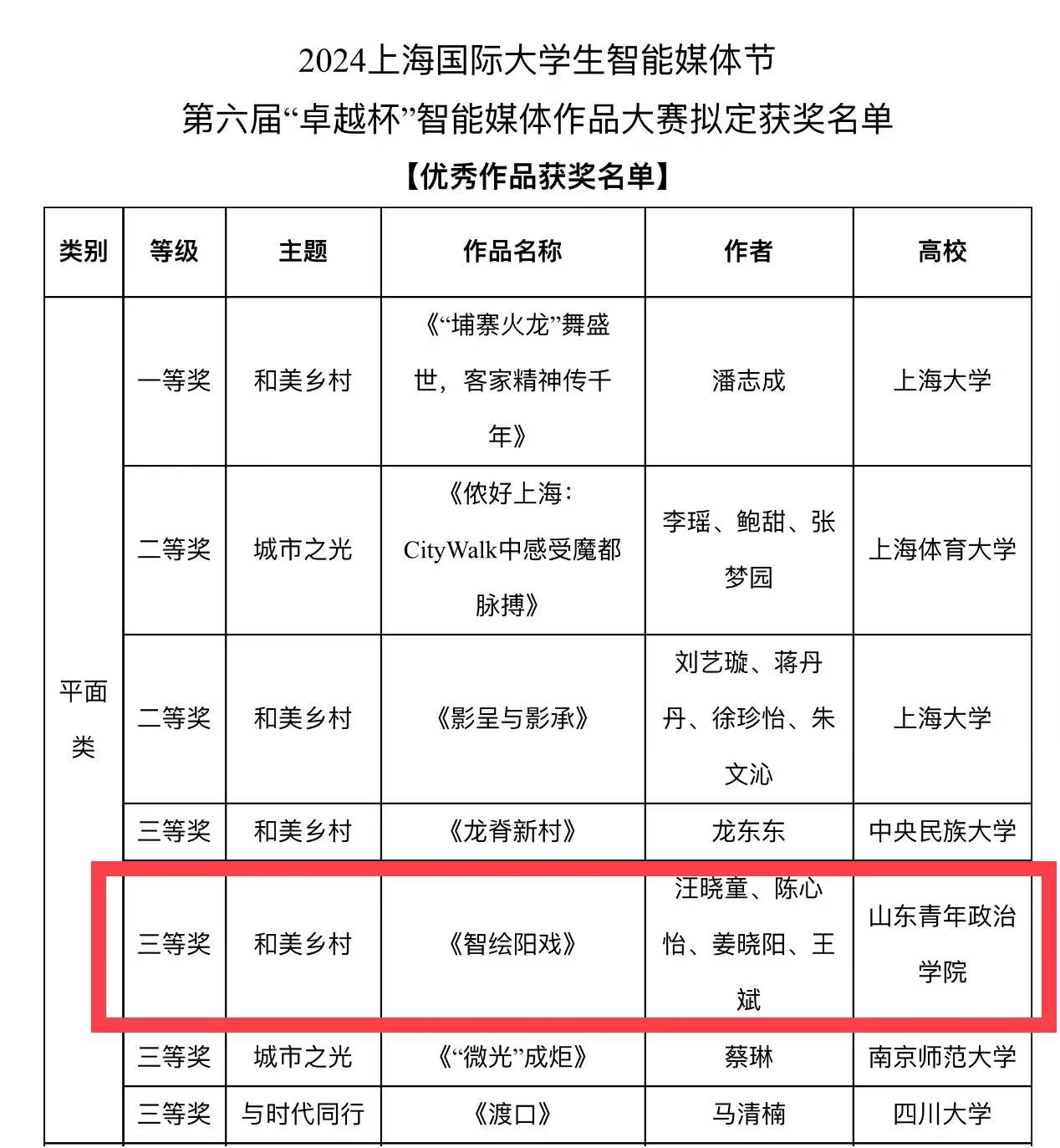 近日,2024上海国际大学生智能媒体节第六届“卓越杯”智能媒体作品大赛获奖名单正式公布。由我校文化传播学院教师张奕、储哲哲指导的作品《智绘阳戏》荣获平面类三等奖。获奖团队成员汪晓童、陈心怡、姜晓阳、王斌分别来自2023级数字媒体艺术专业和2022级广播电视学专业。