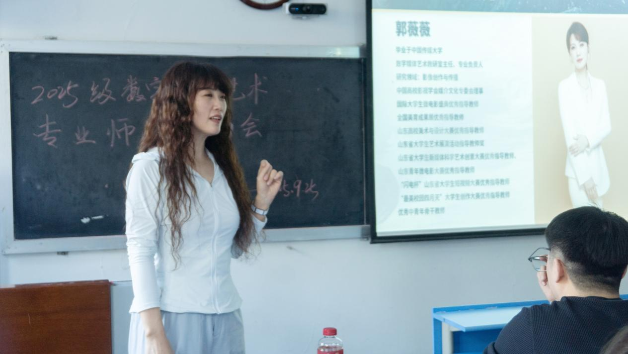 活动伊始,数字媒体艺术教研室主任、专业负责人郭薇薇对2025级新生的到来表示热烈欢迎,并从专业发展脉络、师资团队构成及行业发展前景展望三个维度展开介绍。