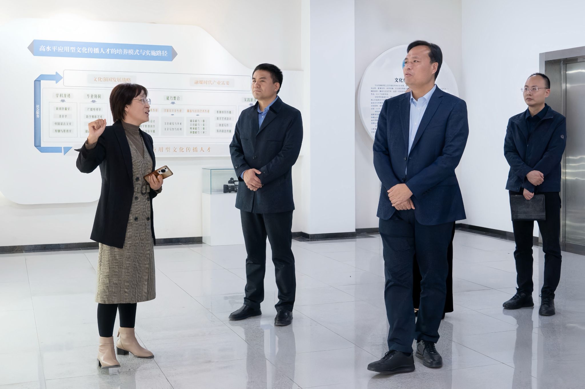 在听取介绍并参观文化传播实验中心后,魏传强充分肯定学校在地域文化资源挖掘和文化产品创意传播等方面凝练的办学特色。他认为山东数字文化集团和学校有关齐鲁文化新发展和数字文化新基建领域的理念高度契合,双方可以围绕齐鲁文化大模型的研发、场景沉浸式文旅演绎、文化类数据标准制定等方面实施具体而深入的合作。