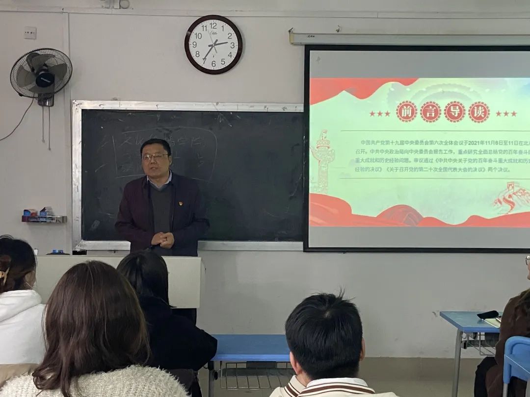 为贯彻落实学习党的十九届六中全会精神,文化传播学院举办党的十九届六中全会精神专题学习班,文化传播学院党委书记王连峰进行开班第一讲,全体学生党员及骨干参加,辅导员参与学习。