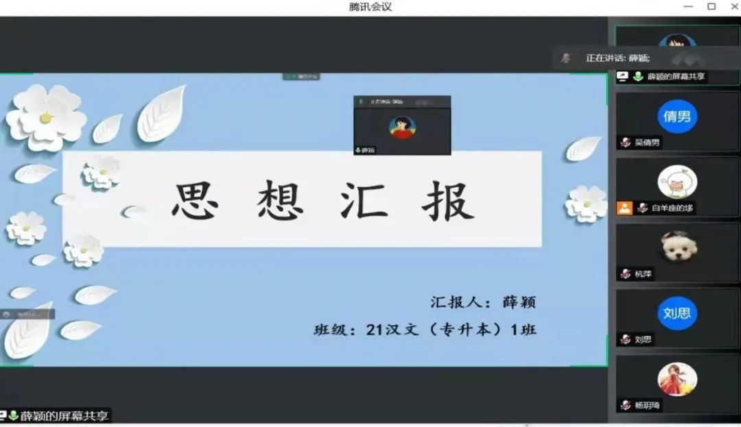 会上,各位积极分子从思想、学习、工作和生活各方面汇报了自己这一季度的成长,阐述了自己的入党动机和近期的学习感悟。各位积极分子也表示,通过汇报的方式进一步明确了自己的缺点与不足,不断加强理论学习,提高政治素养和思想认知水平,努力改正现有不足,积极向党组织靠拢。2020级播音与主持艺术专业李柏萸说:“尽管因为疫情,不能到现场进行汇报,但是我仍然重视本次的线上的汇报并积极准备。通过本次汇报,进一步明确了自己在上一个季度都做了什么,学了什么,下一步,我将继续学习,提升自己,真正做到为人民服务。”