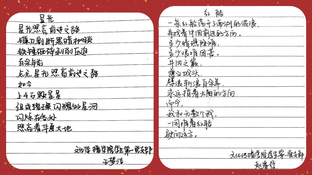 为引导党员干部牢记初心使命、坚定理想信念,文化传播学院学生第一党支部开展“青春颂党”诗文撰写主题党日活动。党员们充分发挥专业优势,在作品中融入爱党爱国的情感,从小切口展现党的发展历程和辉煌成就,展现了新时代党员“请党放心,强国有我”的热忱担当。