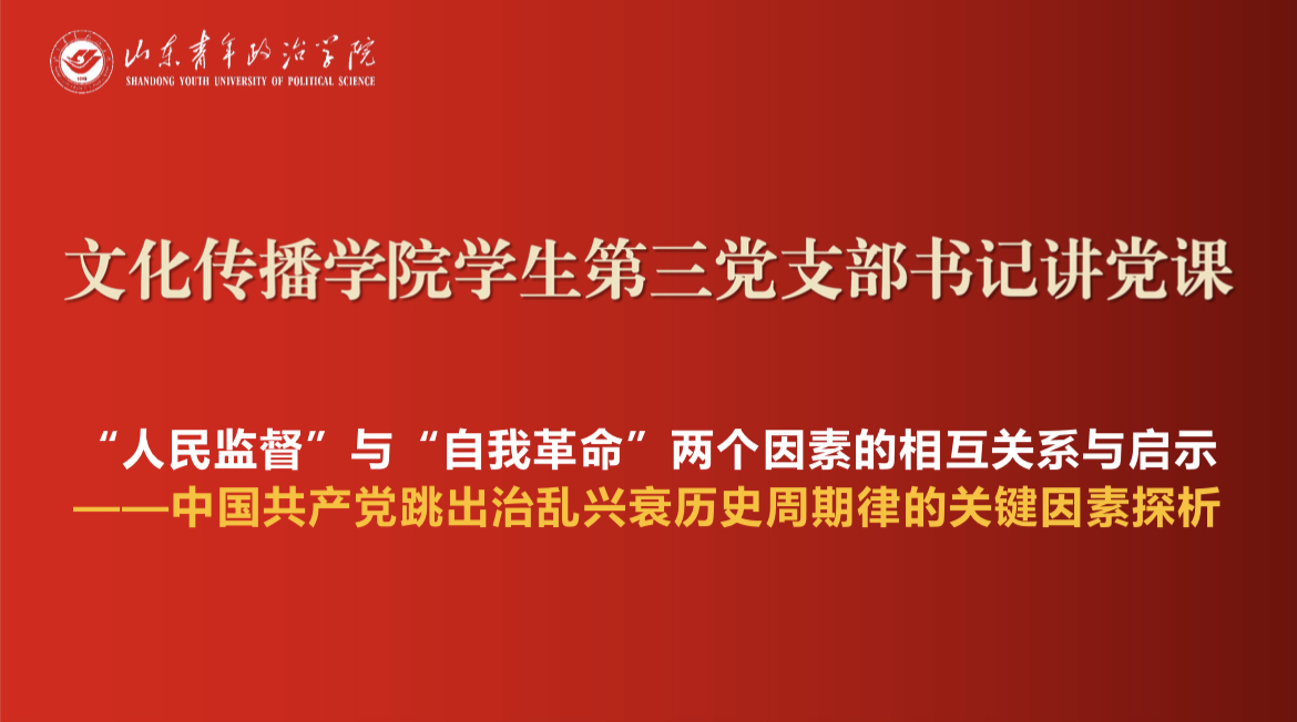 为加强学生党员的理论学习,6月28日,文化传播学院学生第三党支部书记开展“‘人民监督’与‘自我革命’两个因素的相互关系与启示”线上专题党课。