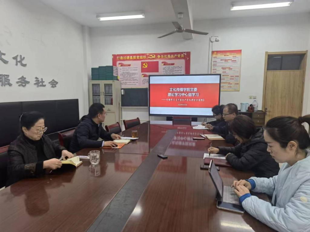 “专题学”:对标纪法教育,筑牢思想根基。文化传播学院党委理论学习中心组专题学习《中国共产党纪律处分条例》,党委书记杜兴东领学,把习近平总书记在二十届中央纪委三次全会上指出的在深入推进党的自我革命实践中需要把握好的九个问题逐条纳入党委理论学习中心组学习计划。抓实教职工政治理论学习,把师德师风、教风学风、科研诚信等相关内容融入基层党组织的党员教育工作,夯实党纪学习教育成效。