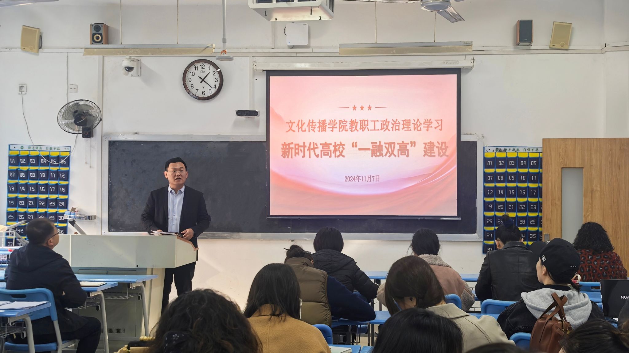 11月7日下午,文化传播学院开展教职工政治理论学习,围绕新时代高校“一融双高”建设话题进行解读,学院党委书记杜兴东主持并领学,全体教职工参加学习。