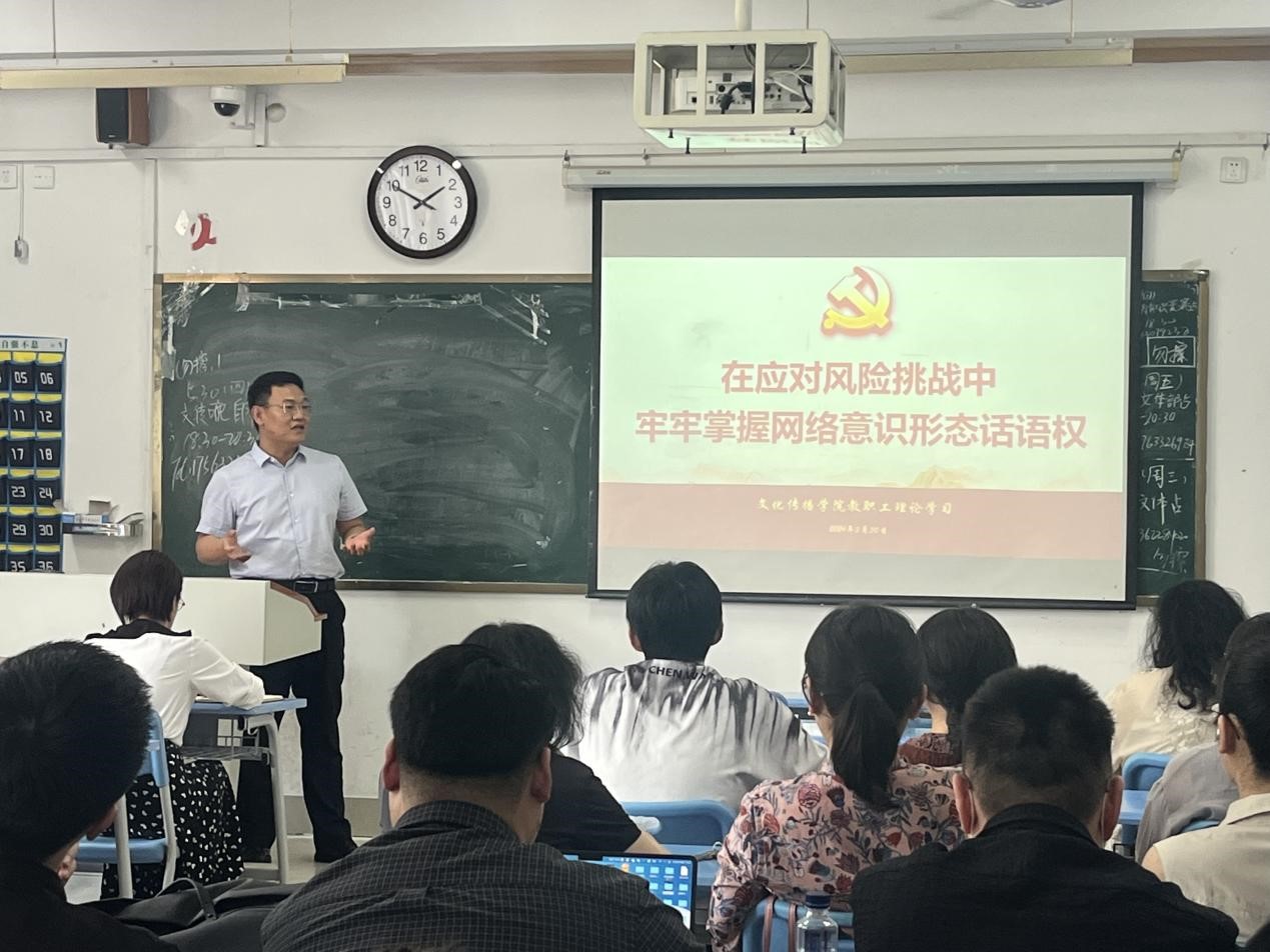 5月30日下午,文化传播学院开展“网络意识形态工作”教职工政治理论学习,深入学习领会习近平总书记关于意识形态工作的重要指示精神。学院全体教职工参加学习,党委书记杜兴东领学,副院长孙晓彦、张振发言。