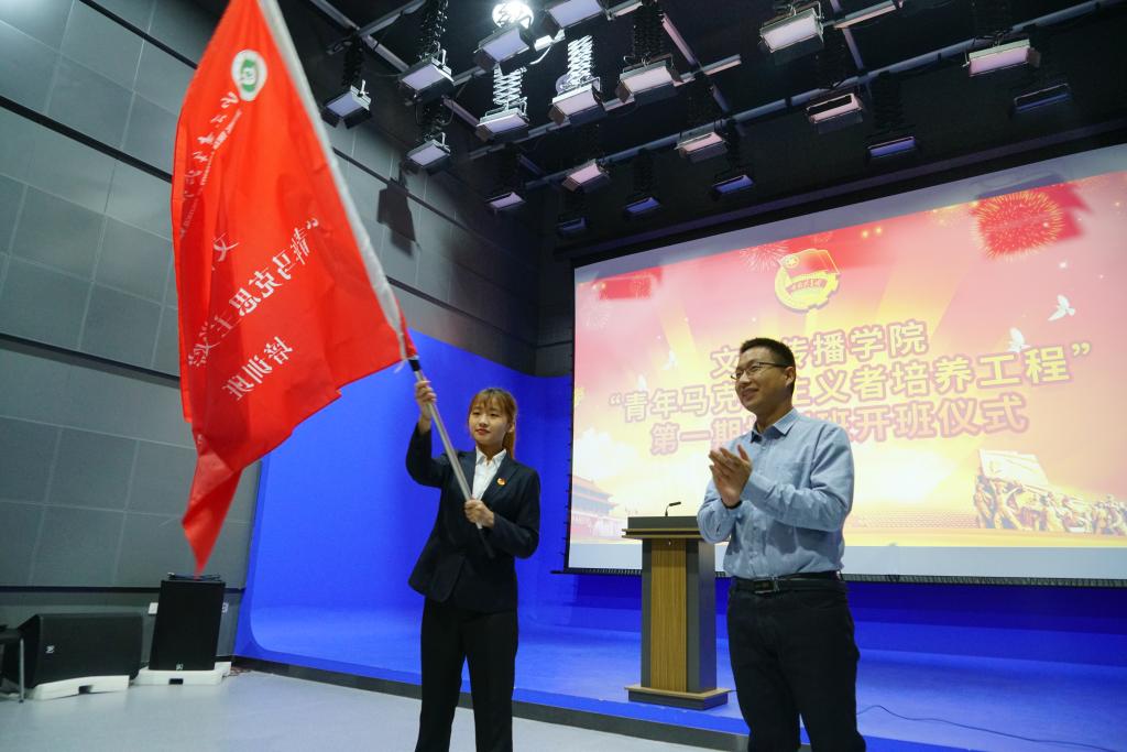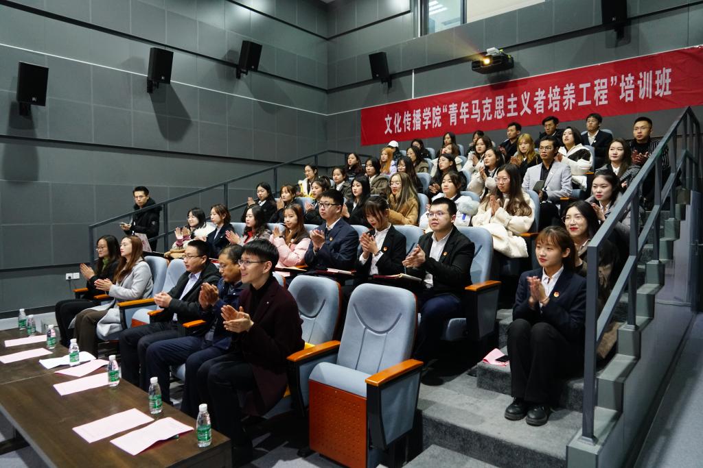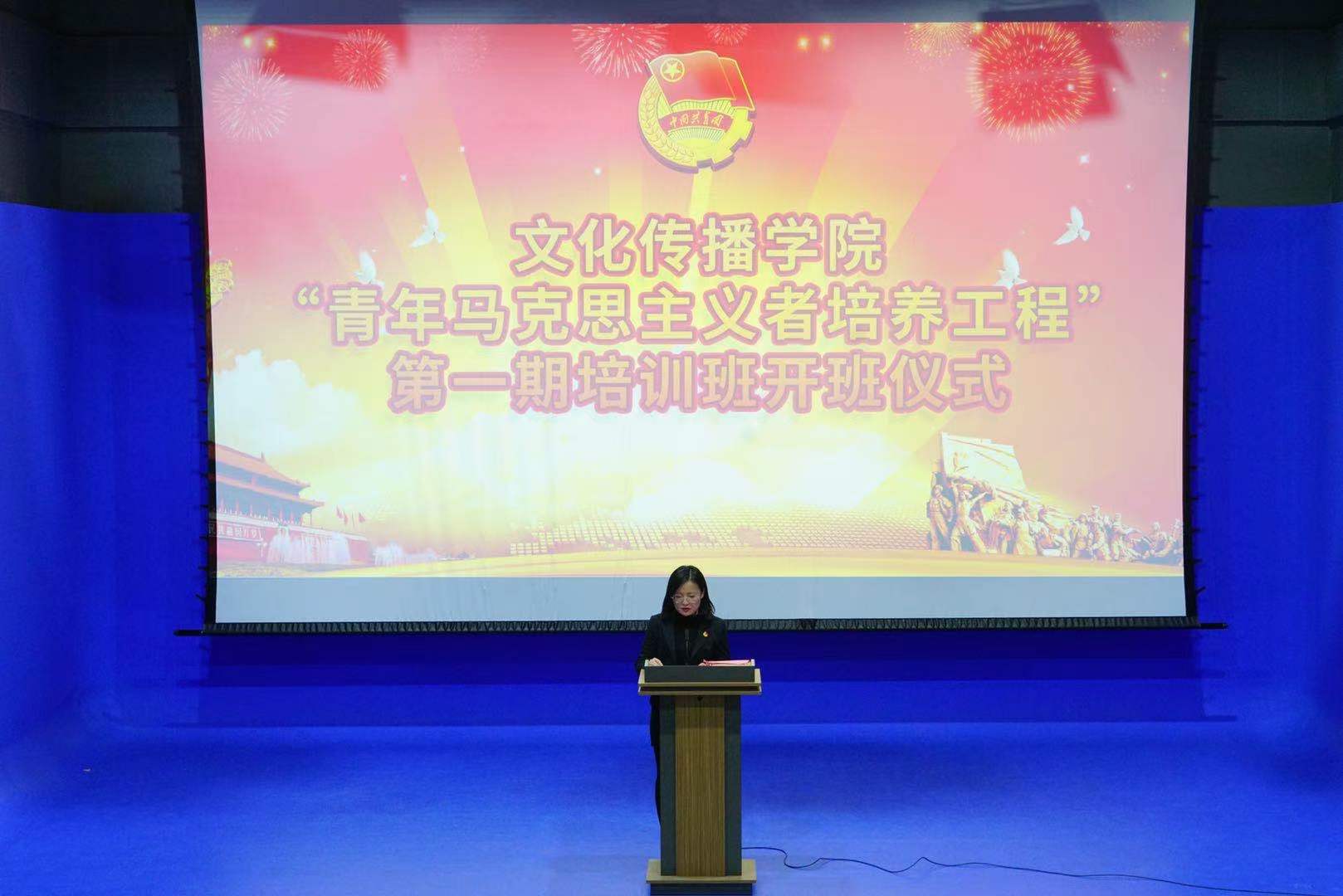 为贯彻共青团中央《“青年马克思主义培养工程”实施纲要》精神,培养全面发展的优秀学生骨干,文化传播学院于11月24日下午,在躬行楼文化传播学院实验中心虚拟演播厅举行“青马工程”培训班开班仪式,并开讲第一课。学校团委书记孟祥佳、文化传播学院党总支书记王连峰、团总支书记刘磊、学院全体辅导员及全体学员参加开班仪式。