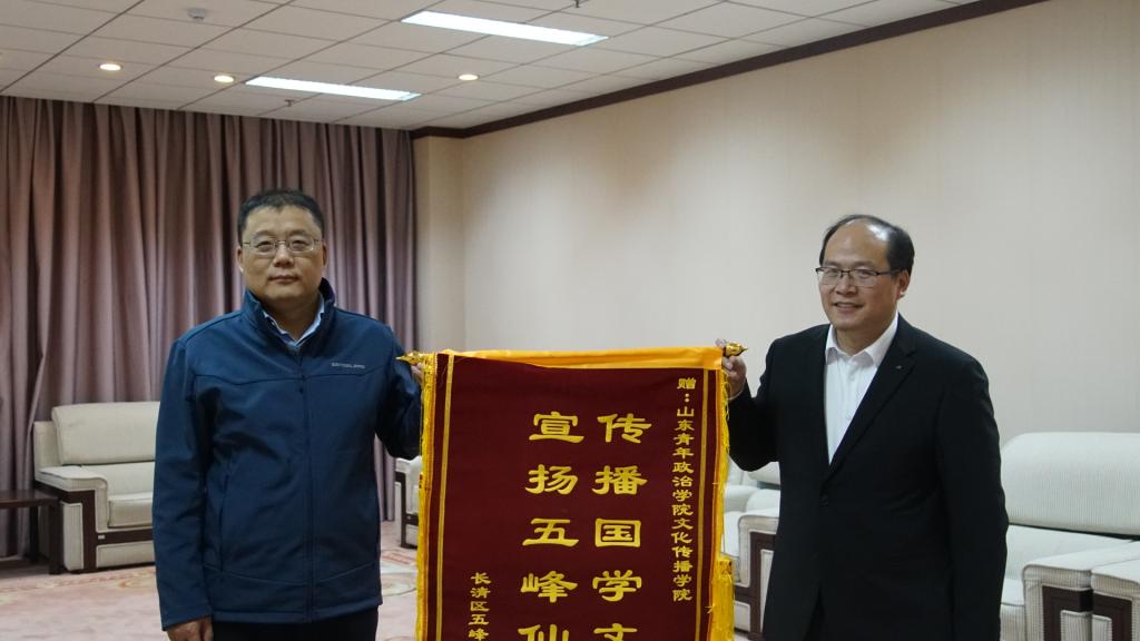 济南市长清区五峰山旅游区服务中心主任刘海光向文化传播学院致感谢信并授旗。刘主任表示,很感谢文化传播学院实践团队,为长清区五峰山建设有声化传播平台,为五峰山的文化输出起到了重要作用。本次社会实践,让我们看到了青年人不怕苦、不怕累的奋斗精神,感受到了“自加压、共奋进、重实效、争一流”的山青精神。衷心希望学院未来发展更上高楼,创新人才培养模式,培育出更多具有“青年特质”的文化传媒人才。