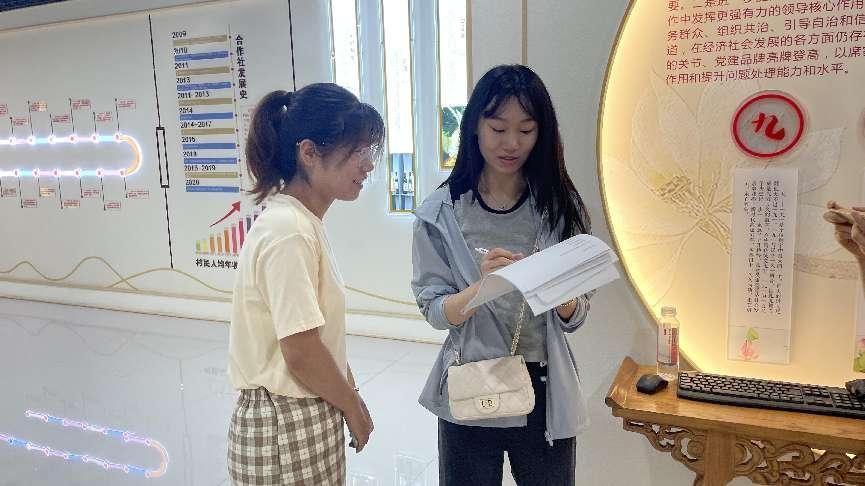 实践团队来到党群服务中心,对乡村振兴专员进行采访,通过乡村振兴专员的介绍,了解席家庄村社区党建、社区治理、乡村振兴、红色文化、优秀家风等方面。