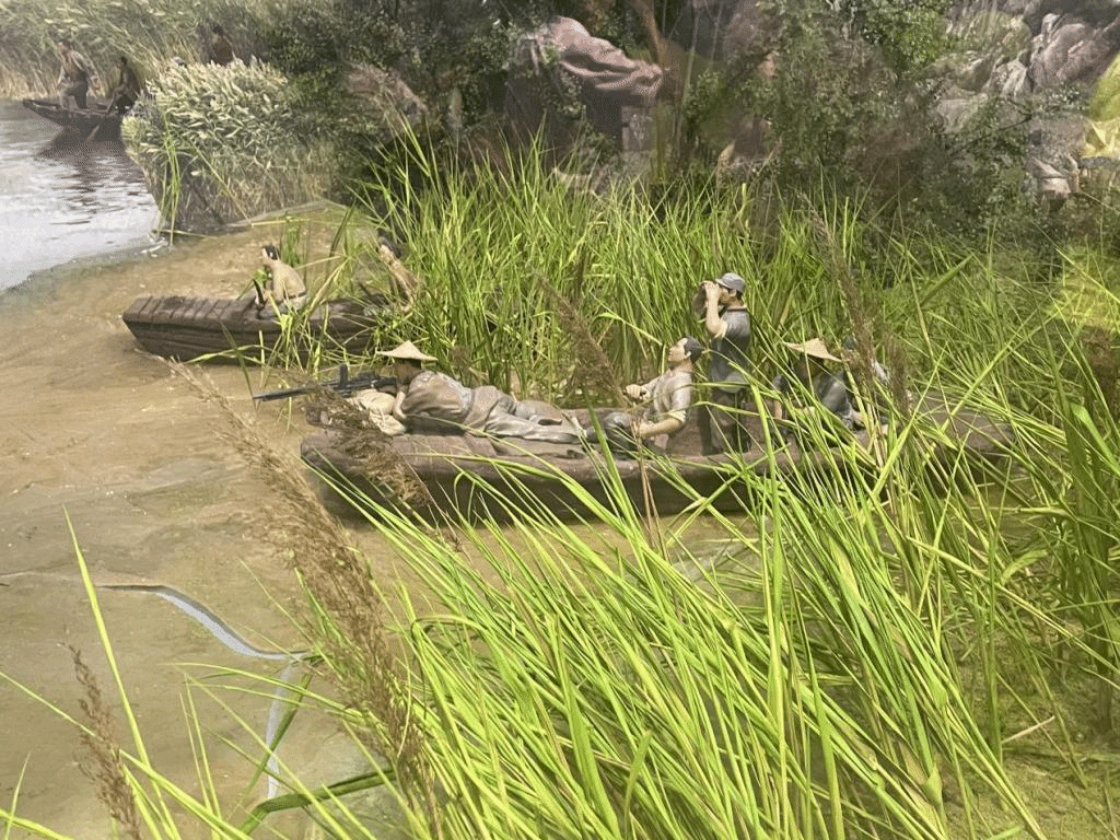 展馆内除了大量的史实资料,还有许多栩栩如生的雕像。借助现代先进的雕塑技术、油画技术,模拟当年的场景,重现先辈的无畏精神。微型雕塑最为生动,模拟了当年微山湖抗日游击战的场景,高大的芦苇间,藏着小小的木船,载着英勇抗战的先辈。