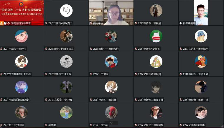 为深入贯彻《关于全面加强新时代大中小学劳动教育的意见》的文件精神,深入开展劳动教育,深化对劳动价值的理解,感悟劳动精神,争做新时代的奋斗者。1月3日上午10点,文化传播学院于线上举办了“劳动奋进二十大乡村振兴谱新篇”寒假社会实践出征仪式。文化传播学院辅导员梁志刚和2023年寒假社会实践学生代表出席本次会议。