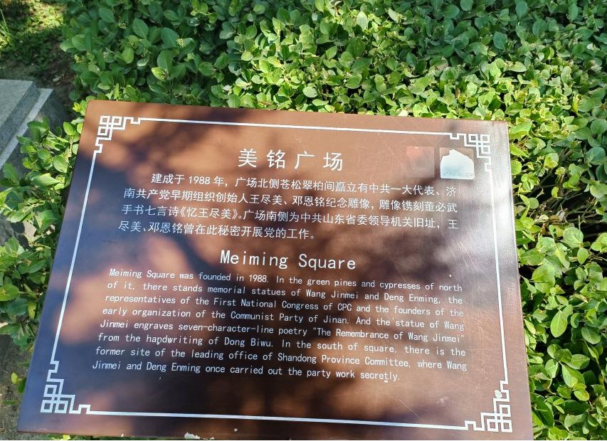 参观纪念馆结束后,实践团成员来到五龙潭公园内的美铭广场,瞻仰王尽美、邓恩铭烈士雕像。