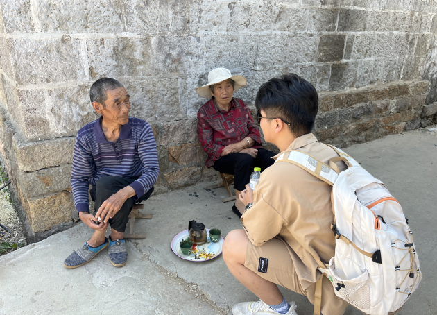 再次走进巍巍村,团队成员首次利用调查问卷进行入户走访,了解到巍巍村当前的基本情况。荣成港西镇巍巍村尚保存20多幢有200多年历史的海草房,巍巍海草房也被山东省人民政府公布为山东省第五批省级文物保护单位。以海草房闻名的巍巍村共三百多户人家,只有二百六七十的常驻住户,村内年轻人多居外地,老年人居多,平均年龄在60岁以上,多从事于种植业,经济收入主要依靠无花果的种植售卖。要想保留、保护村落内原本海草房,急需解决传播传承海草房建筑技艺新血液的缺失,原材料越来越稀少,修缮海草房整体价格昂贵这三大问题。