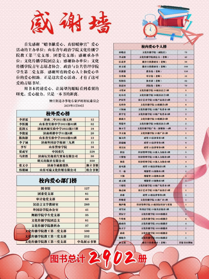 开学后,由山东青年政治学院文化传播学院教工第三党支部、团委党支部主办,文化传播学院团总支承办,文化传播学院青年志愿者协会、政治与公共管理学院学生第二党支部协办的“赠书献爱心,真情暖仲宫”的爱心捐书活动顺利开展。
