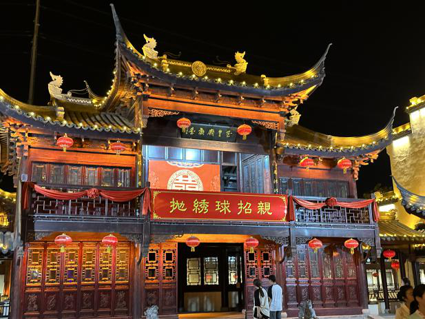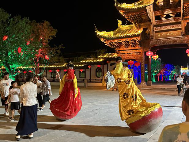 信步景岱桥,团队成员偶遇《临清俏县令》“霸气”巡街,往前走,围观彩楼的《绣球招亲》表演,再往前走,即可驻足观赏双人不倒翁在翥凤翔鸾间与游客间的若即若离。“我们这次的夜游融合了临清的运河文化资源,以演绎为核心,”园区内的工作人员向成员们介绍道,“我们的节目表演融合了民俗演艺、实景演艺等形式,打造了8个大主题舞台,近20个夜游主题演艺。”