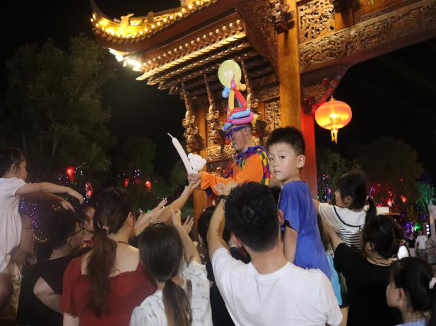 团队成员来到了演艺广场,《精卫女神》《锦绣霓裳》等表演讲述古时运河故事,开阔的惠风阆苑广场上则表演着皮影戏、江湖杂耍和舞狮等民俗节目,舞者身着汉服,优美的舞姿与光影相结合,在古典雅致的东宛园里,给人以如梦似幻的体验感。