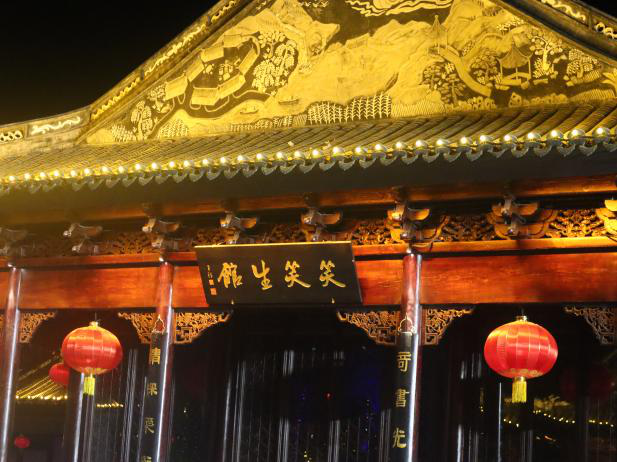 走过“兰生空谷”前厅,就正式进入了东宛园。园区内,古式建筑高低错落,飞檐挑角,游人熙熙攘攘。园区东面复建了《金瓶梅》中多次写到的临清兵备道,它不仅是兰陵笑笑生创作的重要素材,也是临清官衙文化的重要组成部分。西面一路欢歌笑语,《笑笑生迎宾》的表演者与前来的游客热情互动,打开了夜游的序幕。
