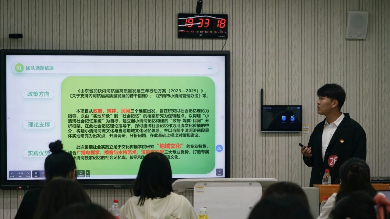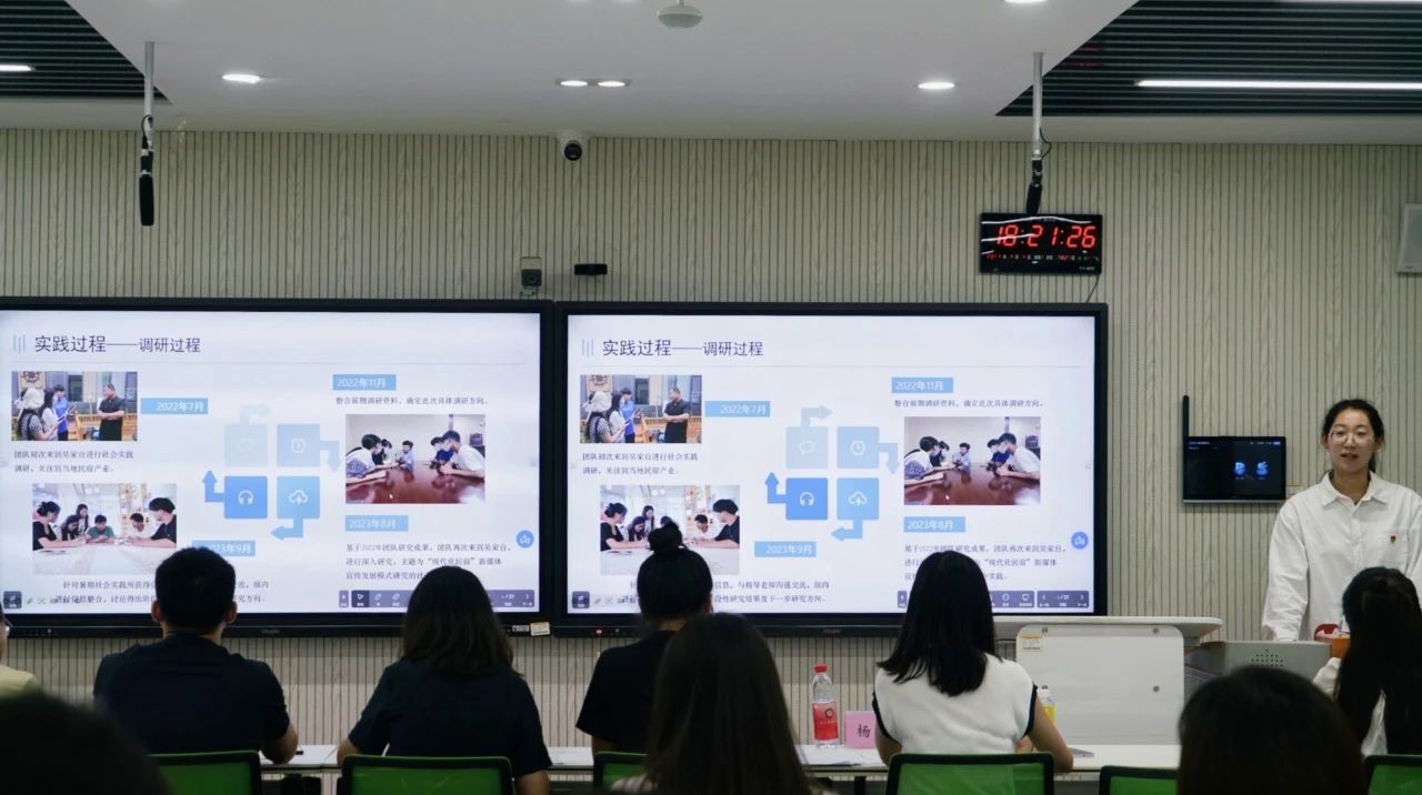 李杨在致辞中表示,文化传播学院2023年暑期社会实践开展成效显著、成果颇丰,做到了覆盖范围广、落实情况好、活动成果优,凸显了青年学生昂扬向上的精神面貌与奋发有为的青年担当,为日后学院社会实践活动的开展提供了一个良好的范本。参与答辩的46支团队,选材丰富,涉及理论宣讲、国情观察、弘扬红色文化、弘扬优秀传统文化、乡村振兴、志愿公益服务等多个主题。答辩现场,各个团队汇报人围绕项目的实施、成果、宣传以及实践收获等内容进行了详细的阐述和总结,彰显了青年学生踔厉奋发的精神,有理想、敢担当、能吃苦、肯奋斗、紧跟时代步伐的良好风貌。