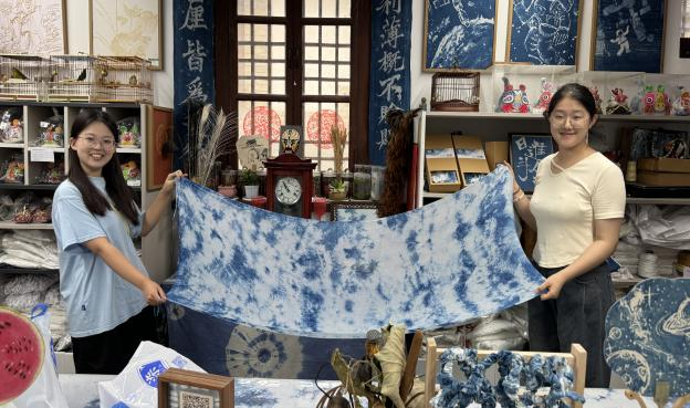 7月19日-7月20日,“匠心染艺薪火相传”社会实践团队走进烟台市芝罘区所城里玖染布艺扎染工坊开展实践,采访非遗草木染传承人魏岳,探寻草木染技艺活态传承与创新发展新途径。魏岳提到,他目前正借助短视频平台等新媒体平台扩大草木染的影响力。同时,玖染布艺扎染工坊注重人文关怀,通过草木染等手段辅助自闭症群体就业。魏岳表示,草木染作为一种天然无害的植物染色技艺,可以尝试作为自闭症等特殊群体连接社会的桥梁,在社会服务方面具有很高的可行性。随后,团队成员亲身体验草木染的围巾扎染,在实践中感受草木染的独特魅力。