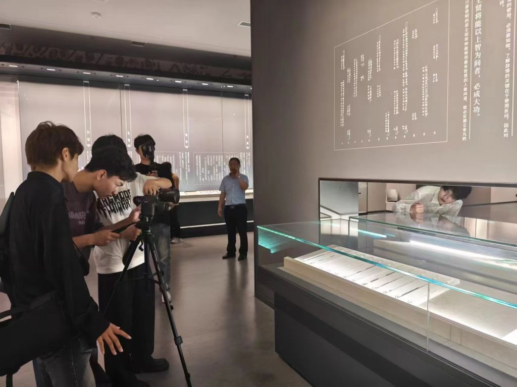 当日上午,团队成员来到银雀山汉墓竹简博物馆。这里不仅是省级重点文物保护单位,更是《孙子兵法》和《孙膑兵法》的重要出土地点,其简牍的文化价值巨大。团队成员在此了解了简牍的制作过程与文字的演变,直观地感受了汉字深厚的底蕴。随后,团队成员在银雀山汉墓进行采访,并通过与青岛商学院进行学习经验交流,分享、传递了自身对汉字传承的见解及面临的挑战,进一步印证了临沂深厚的文化底蕴,同时推广了深埋于地下数千年的简牍文化。