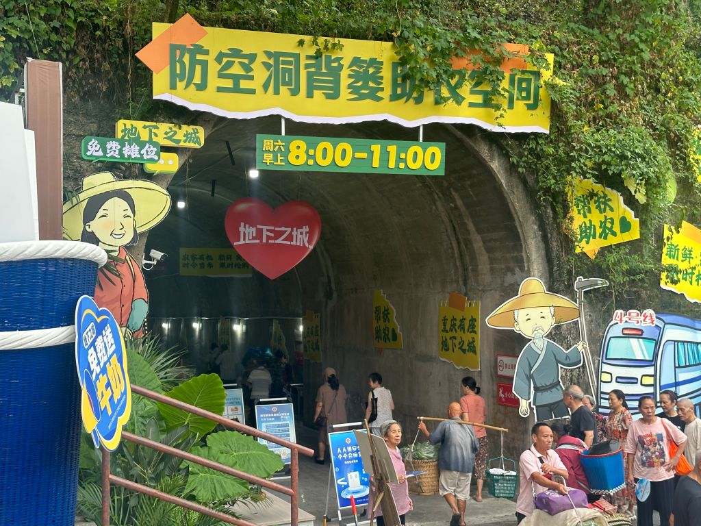 在背篓专线的另一端,一个充满历史韵味的防空洞被改造成了专为搭乘着“背篓专线”石船镇菜农的菜市场。走进菜市场,通道两旁摆满了摊位。团队成员了解得知,这里曾是抗战时期的重要避难所,如今,为了进一步连接城乡发展,助力乡村振兴,解决石船镇菜农们“买菜打游击”的问题,防空洞菜市场化身成为他们稳定的销售场所。