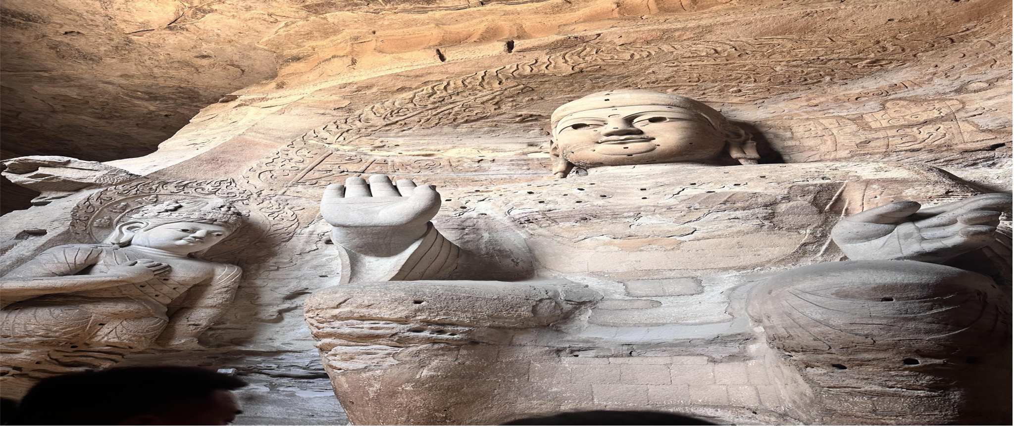 8月21日,团队到达山西省大同市云冈石窟,一睹千佛崖窟的风采。作为中国古代石刻艺术瑰宝与全球文化遗产的重要组成部分,云冈石窟蕴含丰富历史艺术价值,是研究宗教艺术、文化交流的宝库。调研过程中,团队成员们与当地研究人员深入交流,详细记录了自北魏以来云冈石窟的历史变迁。岁月失语,唯石能言,团队成员用专业设备记录下云冈石窟精美的石刻,用现代科技留下了最为不朽的文明。