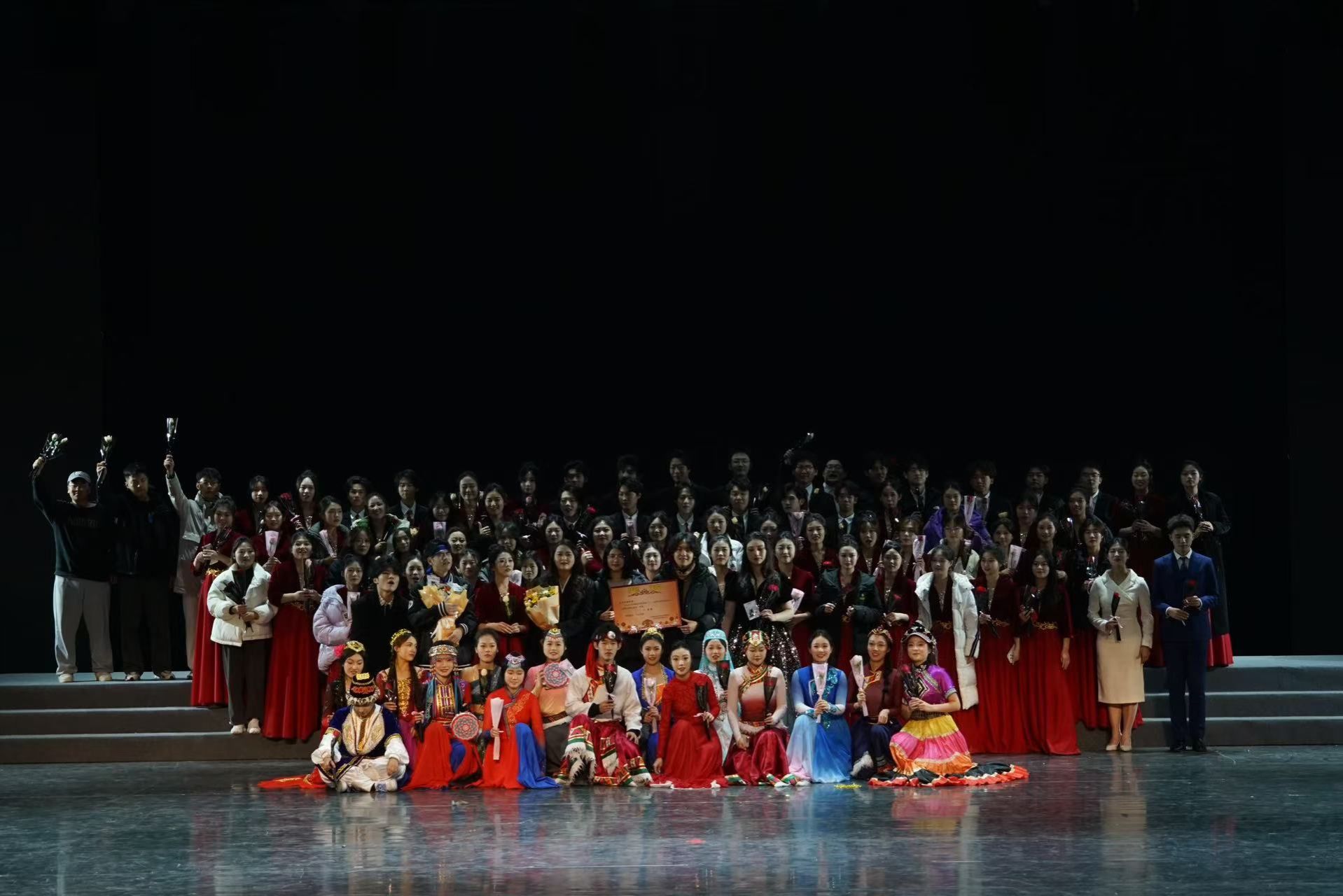 在比赛现场,我院合唱团成员女生身着红裙,男生身穿黑色西装,精神抖擞、神采飞扬。首先他们伴随着铿锵的节奏,以洪亮的歌声演绎了《祖国不会忘记》,紧接着,《我爱你中国》以悠扬的歌声和多民族特色的舞蹈,搭配富有节奏的鼓点,为整场表演增添了几分别样的风情,舞步与歌声交相辉映,为现场观众带来了一场视觉与听觉的双重盛宴,获得全场观众的热烈掌声和欢呼声,也赢得了评委与观众们的一致认可。最终,学院荣获一二·九合唱比赛“一等奖”“最佳指挥奖”“优秀指导教师”等多项荣誉。