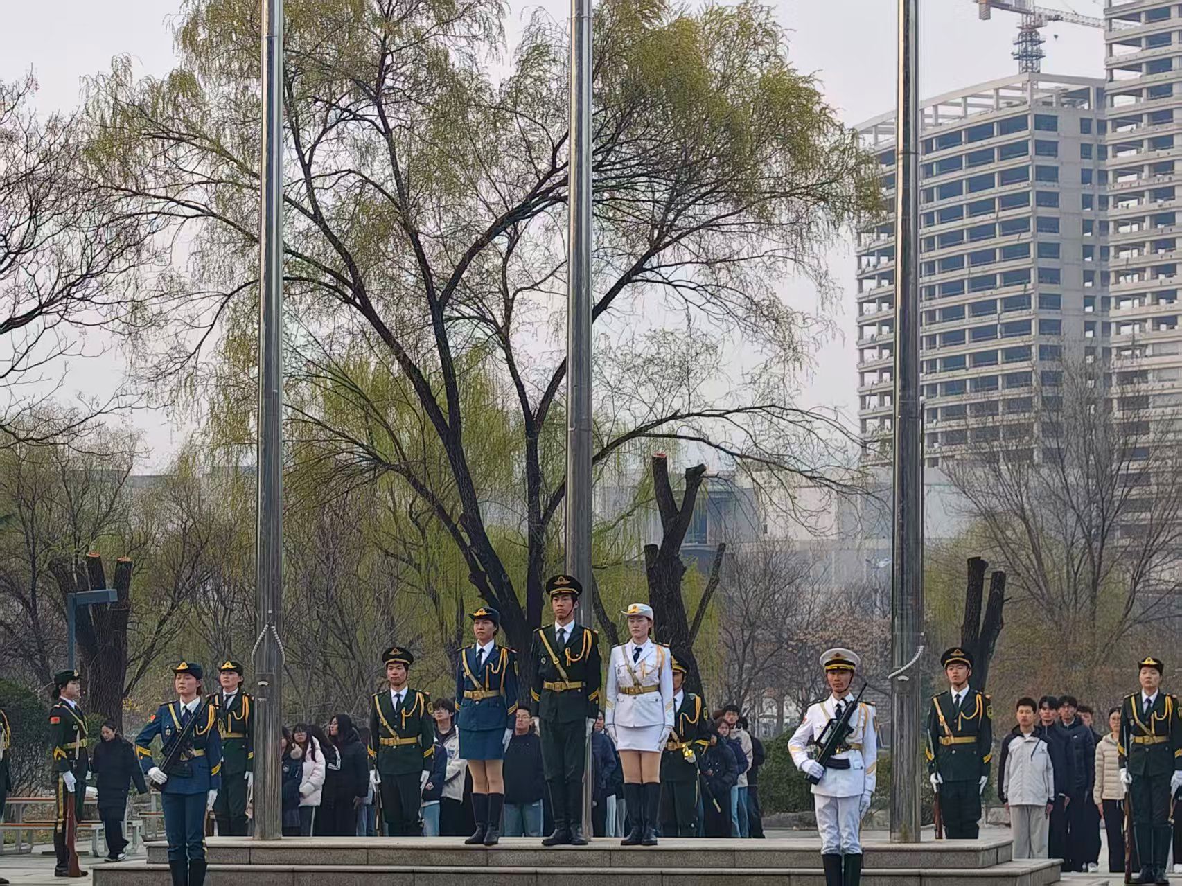 晨光熹微中,国旗护卫队成员迈着铿锵有力的步伐,护送五星红旗走向升旗台。激昂的国歌奏响,五星红旗迎着春风冉冉升起,在场学生面向国旗庄严肃立、行注目礼,目光追随着迎风招展的旗帜,崇敬与自豪溢于言表,尽显新时代山青学子昂扬向上的精神风貌。