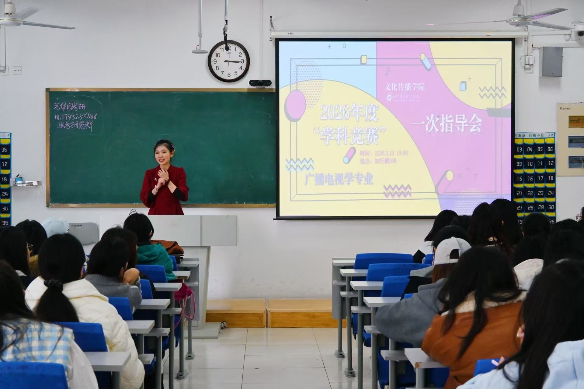 为进一步提升学生影像创作能力与作品质量,深化影视实践教学,全面培养学生创意能力与专业素养,3月19日下午,广播电视学专业于知行楼308顺利召开2026年度「学科竞赛」专题指导动员会。广播电视学专业、数字媒体艺术专业教师围绕赛事规则、创作思路与实践路径与同学们开展深入交流与指导。