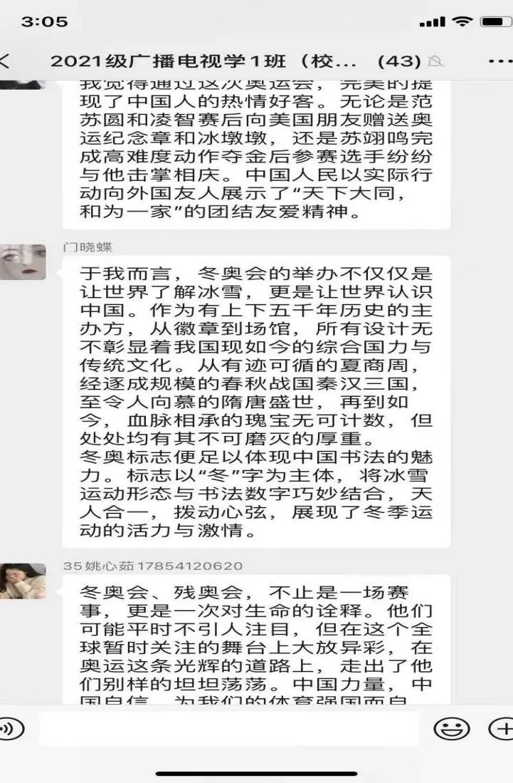 “通过观看‘冰雪’思政课让我明白了,中国青年当保持事争一流、唯旗是夺的拼劲,初生牛犊不怕虎的闯劲,敢于突破自身舒适区,在多角度、多岗位、多领域的学习中增长见识、开阔视野、拓展思维,努力成为可堪大用,能担重任的栋梁之才。‘冷’运动逐渐在大众身边热"起来,青年人也要从北京冬奥会的一组组镜头中汲取踔厉奋发、笃行不怠的前进力量,用实际行动奏响一起向未来的时代强音。”