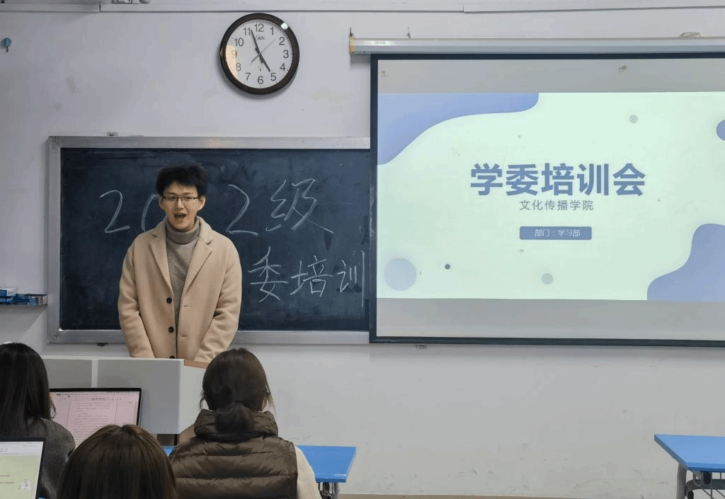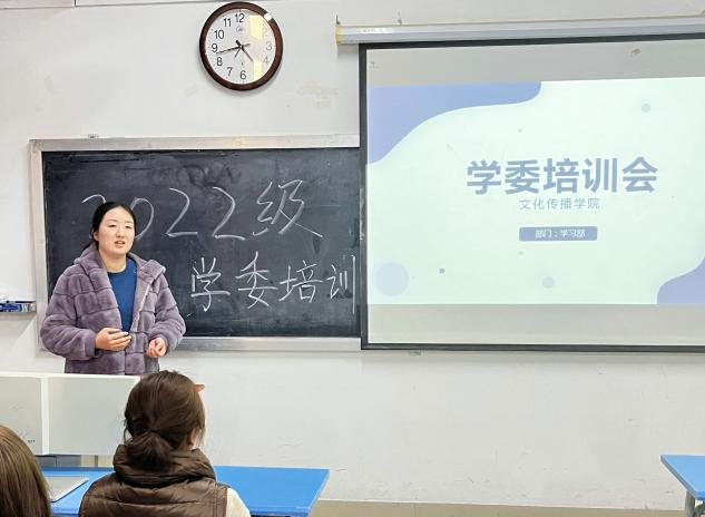 为了充分发挥学习委员沟通教学的桥梁作用,提升学习委员工作能力和自身水平,促进班级学风建设,形成优良的学风氛围,文化传播学院于2月21日下午在敏行楼214教室召开2022级学习委员工作培训会。文化传播学院副院长闫春宇、教科办巩莺歌、辅导员梁志刚、卢姗到会,学习部全体成员和2022级全体学习委员参与此次培训。