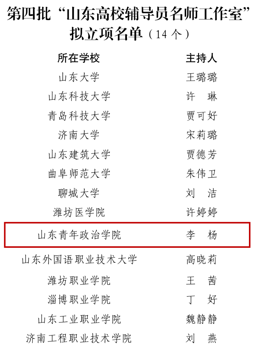 近日,山东省委教育工委、山东省教育厅公布第四批“山东高校辅导员名师工作室”立项名单,文化传播学院党委副书记李杨主持的辅导员名师工作室获批立项。