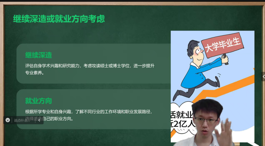 本次培训会从面临毕业的选择与决策、求职准备与技巧提升以及未来发展规划及目标设定等多个方面展开讲解。首先,梁志刚对出国留学、考研考公和直接就业三类方向进行深入分析,帮助应届生合理选择未来发展方向。随后详细地为学生讲解了当下就业市场中的企业运行机制与招聘机制,并向学生介绍了企业招聘中“金九银十”的招聘原则,督促学生抓住机会,及时就业。最后,梁志刚将话题聚焦于学生的职业发展规划,督促学生合理规划时间,在准备考研考公的同时也不忘了解企业招聘信息。他鼓励学生树立积极的心态,将个人兴趣与职业发展规划相结合,以便在就业市场中找到更高质量的就业岗位。