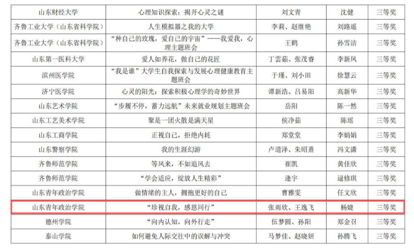 近日,山东省高等学校思想政治教育研究会公布“2024年山东省高校心理健康教育月展示活动”评选结果,由我院辅导员杨婕指导,学生张雨欣、王逸飞主讲的作品《珍视自我,感恩同行》在心理健康教育主题班会评比中荣获省级三等奖。