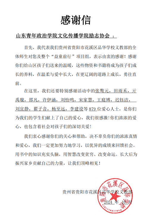 近日,贵州省贵阳市花溪区品华学校义教部向我校文化传播学院励志协会发来感谢信,对“众光汇聚,携童筑梦”公益活动中的优秀指导教师田文霞、杨婕以及879位优秀志愿者学生张骜元、杨至远等给予了高度认可和表扬。