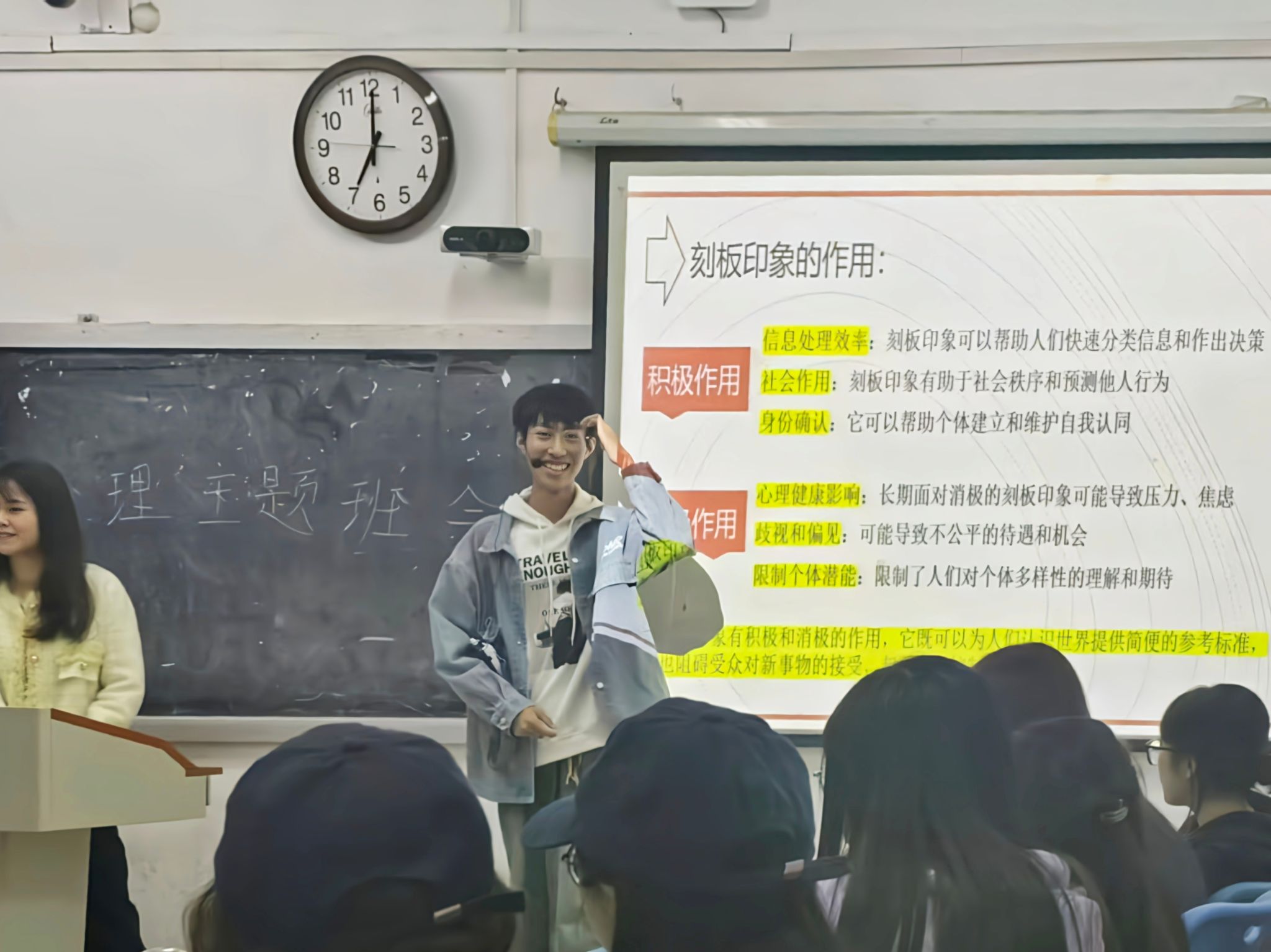 班会中,各班心理委员立足实际,分主题进行讲解。通过互动式讨论与小组活动的巧妙结合,各班心理委员引导学生深入认识不同的情绪类型及其外在表现,体现情绪管理的主题;通过播放励志脱口秀及精彩演讲视频,帮助学生提升沟通技巧,体现人际交往的主题;通过创新性引入谣言传话筒、集体绘画等趣味游戏,让学生在参与中明确刻板印象的双重影响,体现认识自我不被定义的主题。班会过程中,学生展现出高度的专注力与参与度,营造出了和谐融洽的班级氛围。各班心理委员纷纷表示,希望能够将自己所学的专业知识有效地运用到实践中,切实地为学生提供心理支持与服务,增进彼此之间的沟通和交流。