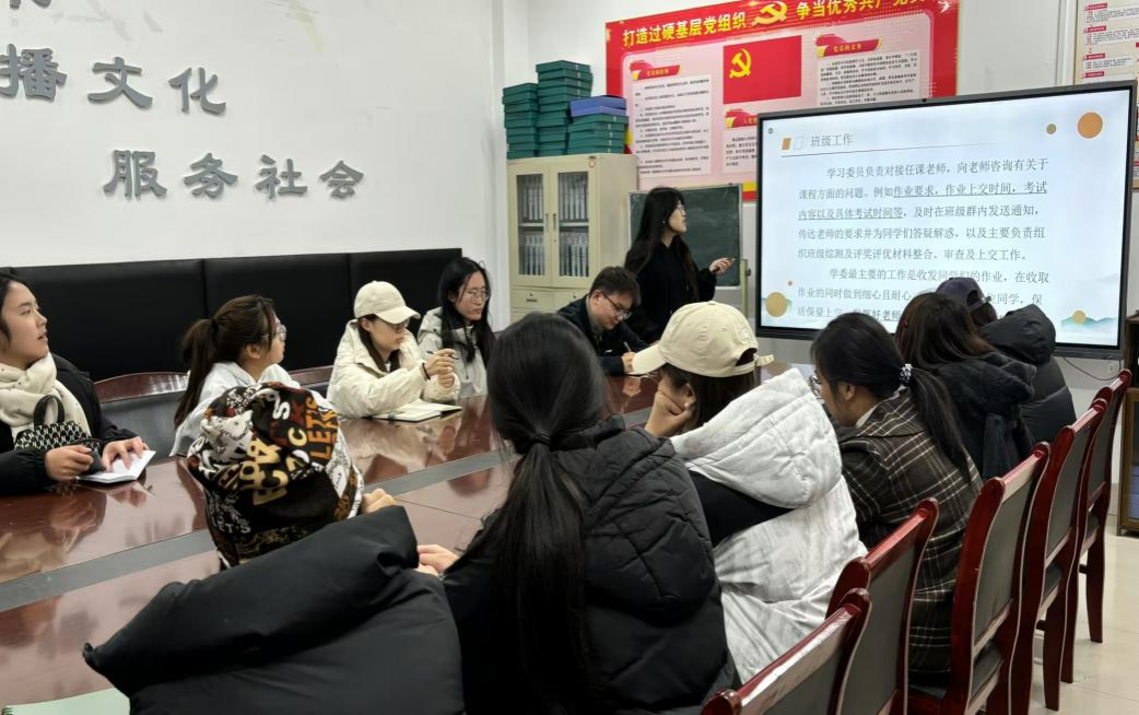为提升学习委员的工作能力和综合素质,形成良好的学习氛围,进一步推动学院学风建设,11月17日晚,文化传播学院召开2024级学习委员工作培训会。文化传播学院2024级全体学习委员和学习部全体成员参与此次培训。