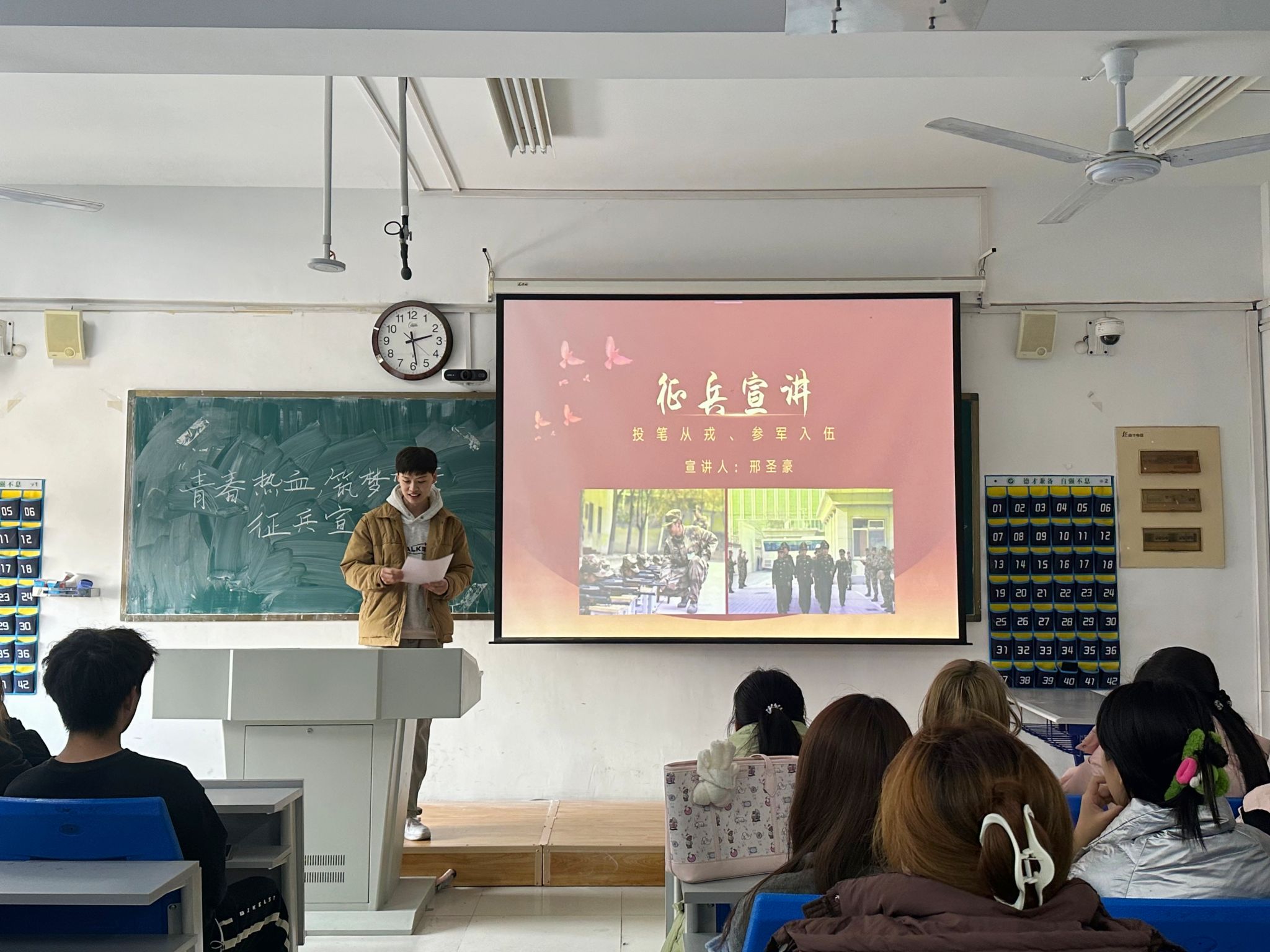 宣讲内容包括入伍流程、部队生活、部队训练、入伍补助等四方面。首先,邢圣豪围绕应征入伍全流程做了详细介绍,包括入伍相关政策、入伍条件等信息,阐述了参军入伍的条件和要求。其次,他通过图片、视频等形式分享了自己在部队的成长经历。最后,他通过具体案例和数据分析,讲解了当兵入伍对于军人及其家庭的优待政策,展示了国家对军人的高度重视和关怀。宣讲结束后,学生们表示,此次宣讲,不仅对大学生应征入伍政策有了更为详尽的了解,还接受了一次深刻的爱国主义教育和国防教育。