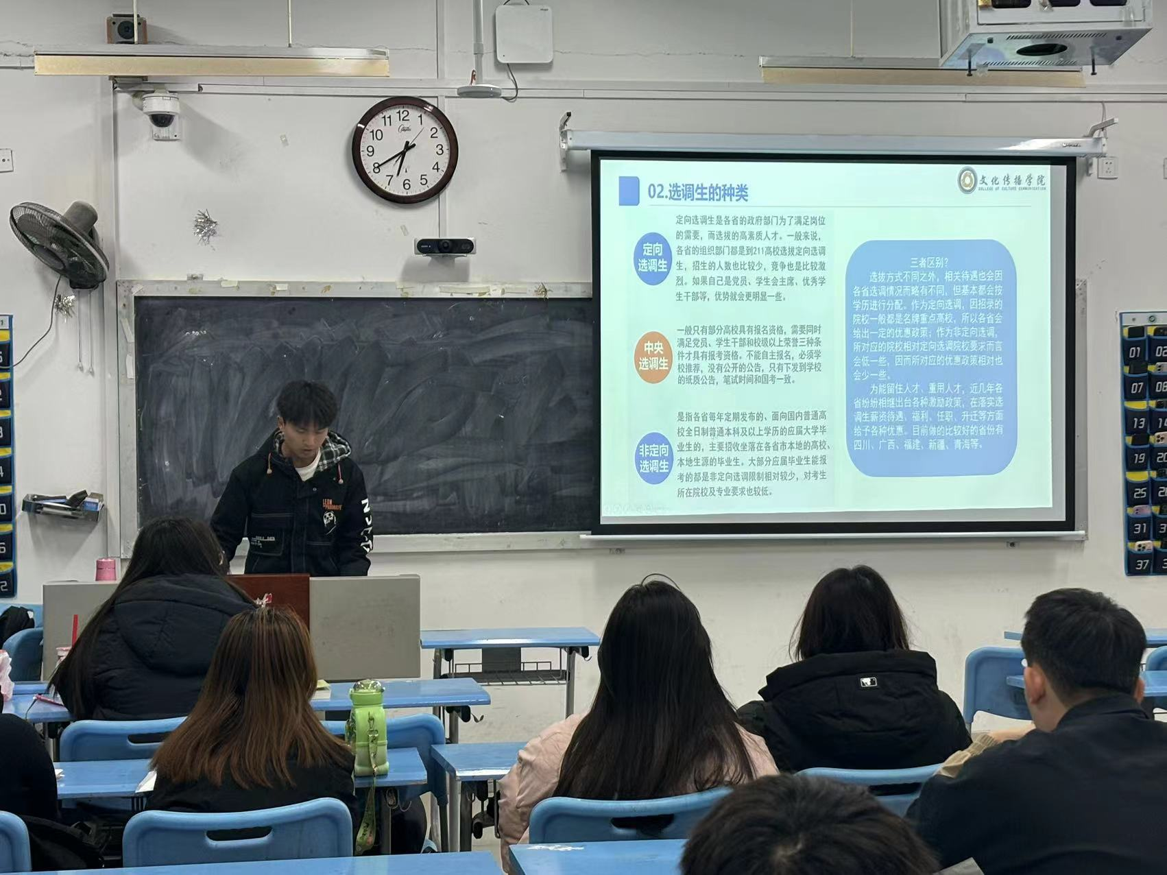 活动伊始,宣讲人员为学生们系统介绍了选调生和三支一扶的概念、分类、报考条件、流程,并结合相关实际案例进行分享。同时,宣讲人员还就学生们普遍关心的问题进行了详细解答,鼓励学生们积极加入选调生和三支一扶的队伍,为国家基层建设贡献力量。