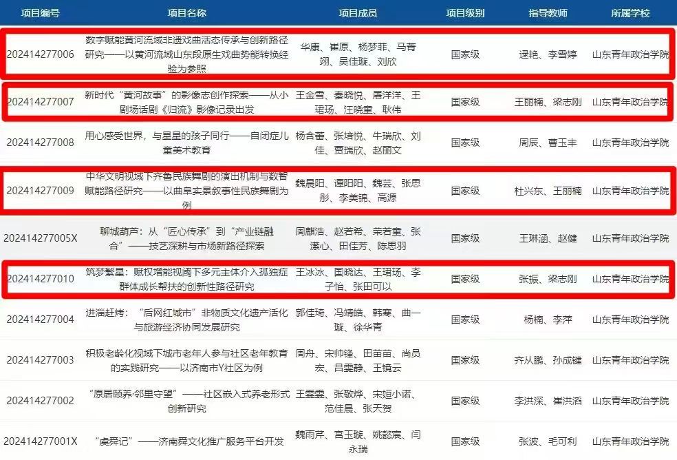 近日,教育部高等教育司发布《关于公布2024年国家级大学生创新训练计划项目和重点支持领域项目名单的通知》(教高司函〔2024〕13号),我校10项大学生创新创业训练计划项目获批国家级立项,其中文化传播学院《数字赋能黄河流域非遗戏曲活态传承与创新路径研究一一以黄河流域山东段原生势能转换经验为参照》、《新时代“黄河故事”的影像志创作探索——从小剧场话剧〈归流〉影像记录出发》、《中华文明视域下齐鲁民族舞剧的演出机制与数智赋能路径研究——以曲阜实景叙事性民族舞剧为例》以及《筑梦繁星:赋权增能视阈下多元主体介入孤独症群体成长帮扶的创新性路径研究》四项大学生创新创业训练计划项目获批国家级立项。
