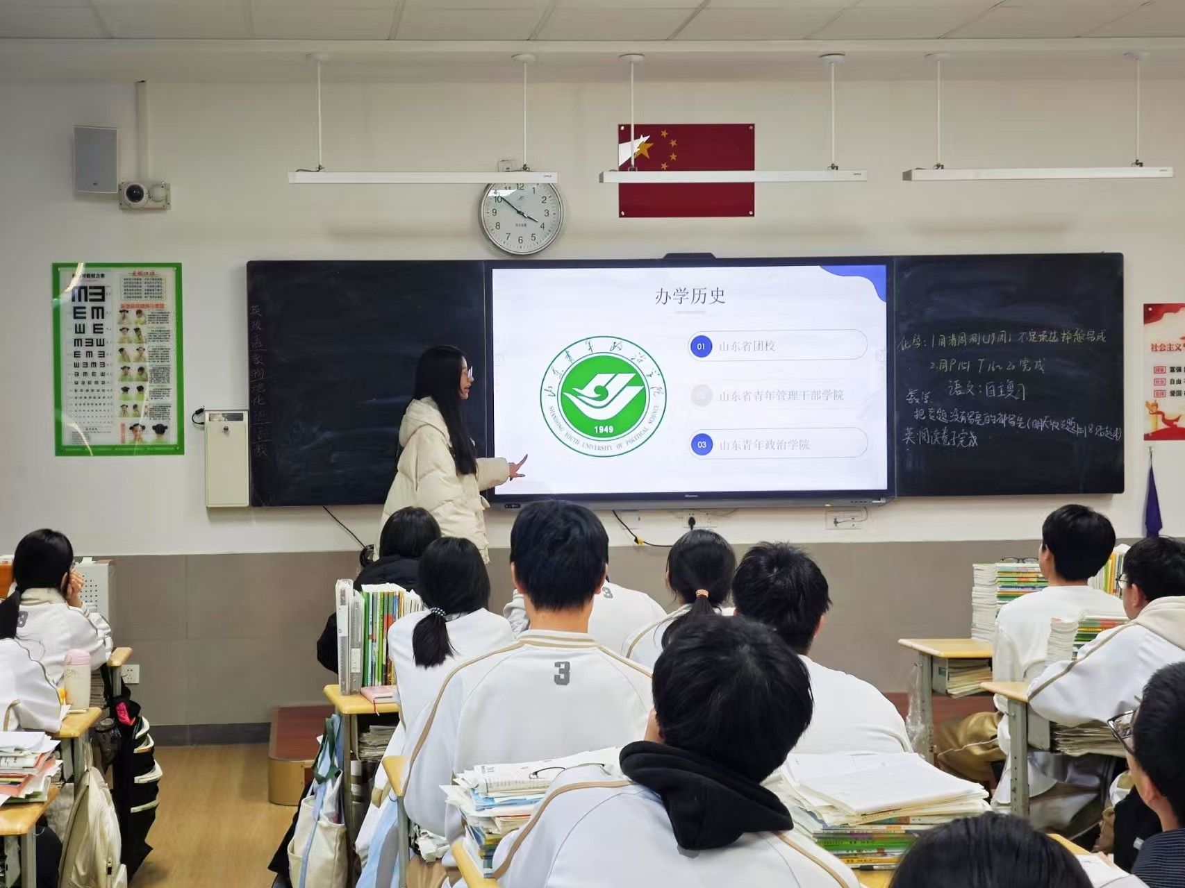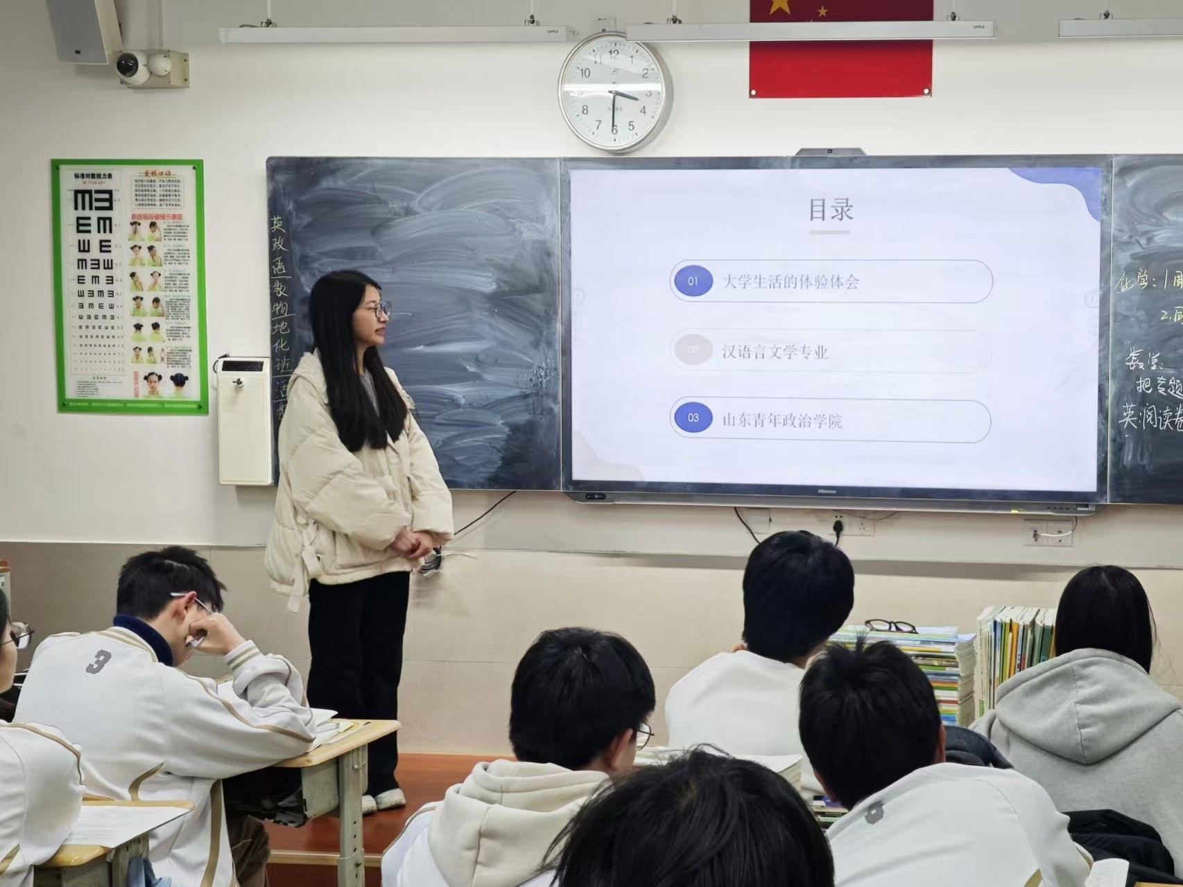 活动当天,团队成员王雪详细介绍了山东青年政治学院的办学特色、校园文化以及近年来取得的辉煌成就,并对所在的文化传播学院进行了详细介绍,她表示,学院学术氛围浓厚,为学生提供了优秀的师资力量以及丰富的实践机会。此外,王雪结合自己的学习经历,分享了在专业学习中的点滴收获和成长感悟,让高中生们对大学生活有了更加直观和具体的了解。