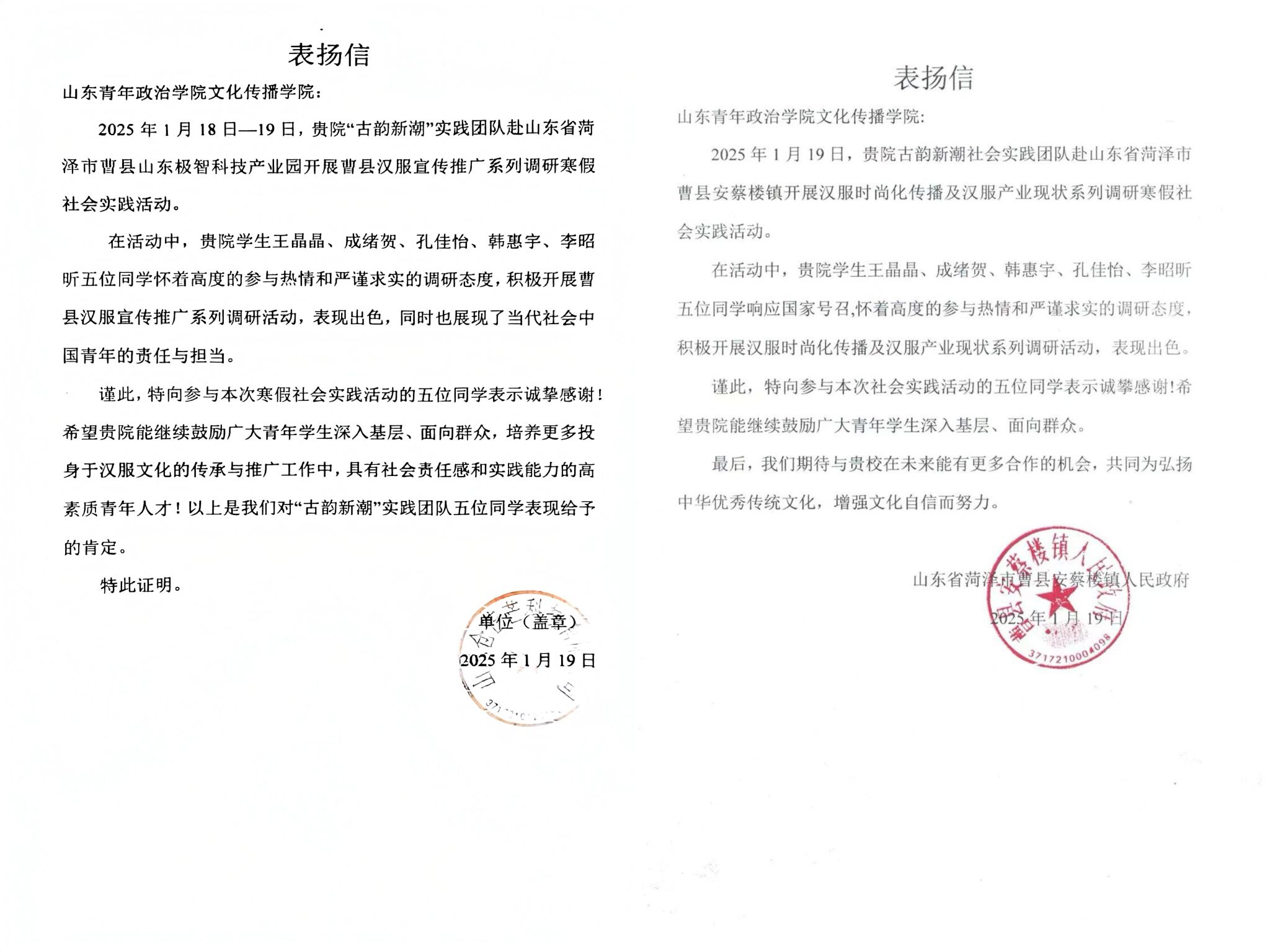 近日,山东省菏泽市曹县安蔡楼镇镇政府及山东曹县极智科技产业园分别向文化传播学院古韵新潮社会实践团队发来表扬信,对王晶晶、成绪贺、韩惠宇、李昭昕、孔佳怡五位同学在社会调研活动中的出色表现给予高度认可与赞扬。