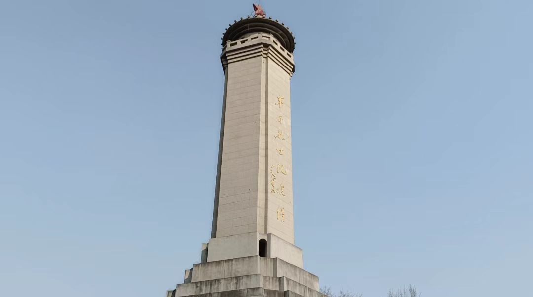 团队成员怀着崇高敬意仰望革命烈士纪念塔。塔高45米,塔的建筑形式为五角亭柱式,分为塔台、塔身、塔顶三部分。塔顶缀以大型景泰蓝质红五星。塔身正面“革命烈士纪念塔”7个贴金大字为毛泽东主席亲笔手书。塔周镶有大小石碑10块,镌刻着山东省人民政府建塔碑文和刘少奇、朱德、刘伯承、陈毅、邓小平、江泽民等党和国家领导人的题词,在题词碑的上方镶有5幅石质浮雕,反映了抗日战争的伟大胜利以及消灭国民党军美械74师的战争场景。