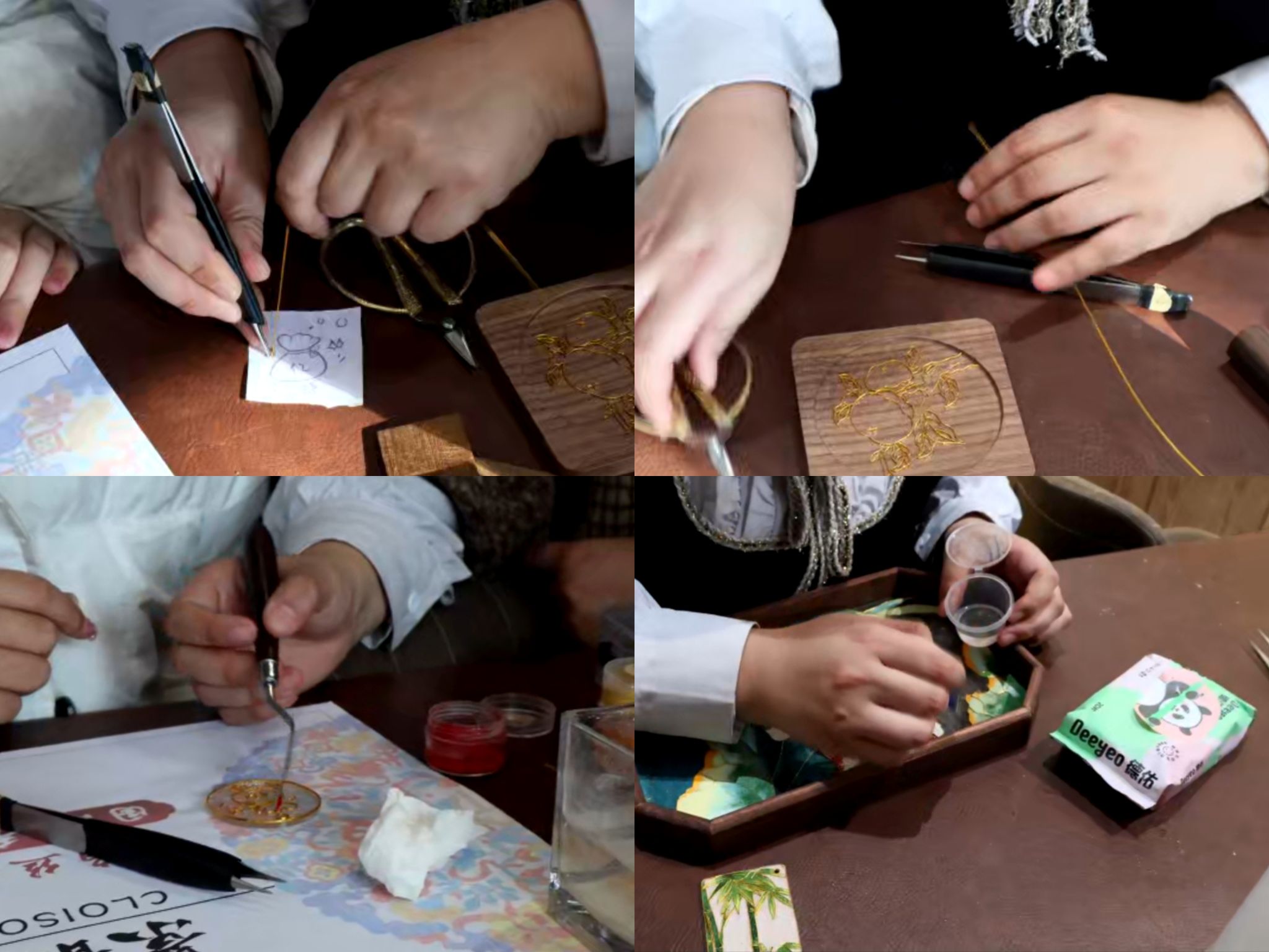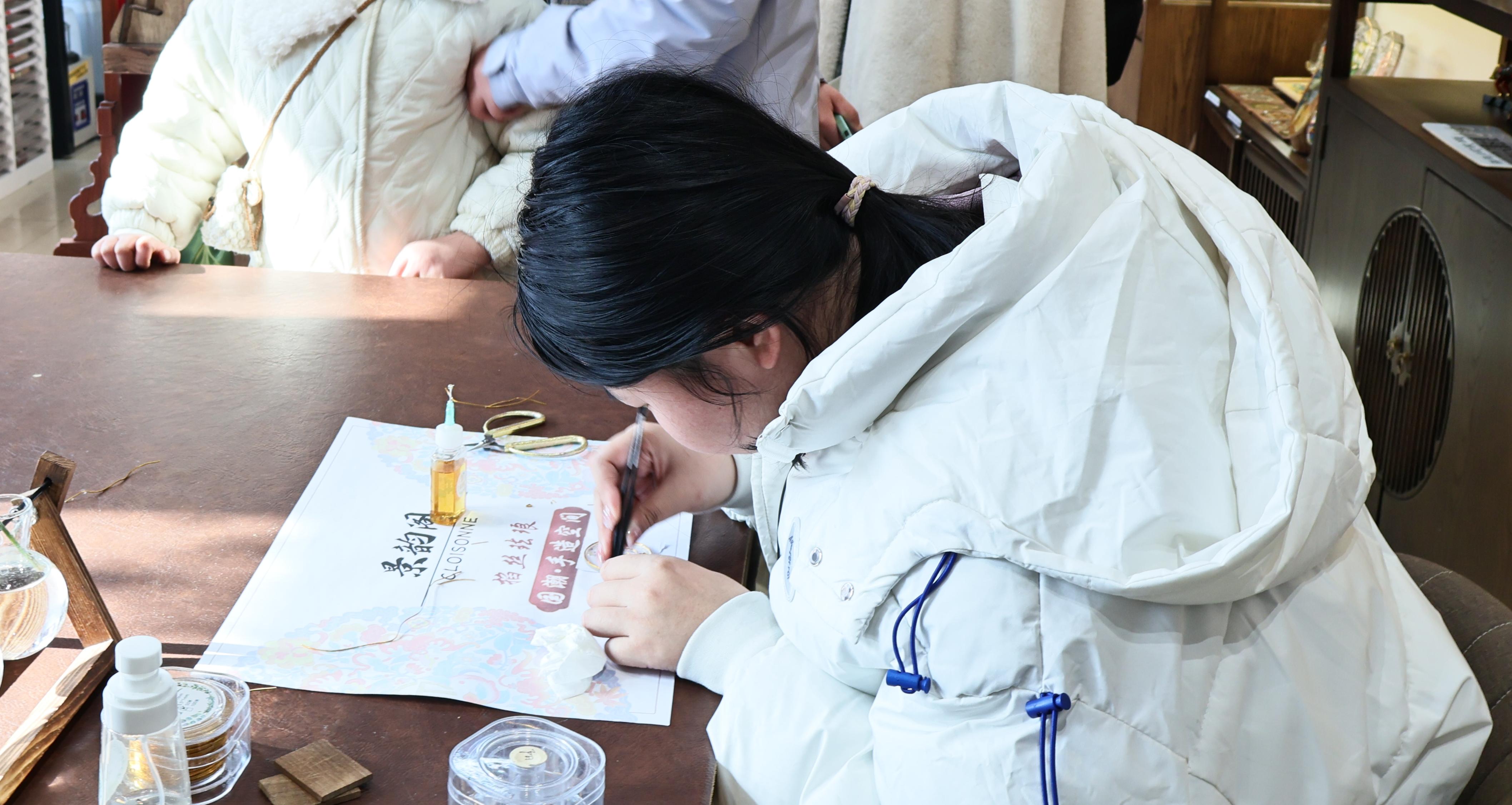 在掐丝环节,传承人用娴熟的手法将纤细的金属丝按照图案轮廓粘在器物表面,并介绍道,掐丝是此技艺的核心环节,需要高度专注。团队成员在传承人的指导下,亲自上手体验了这一过程,体会到了掐丝珐琅制作的艰辛。