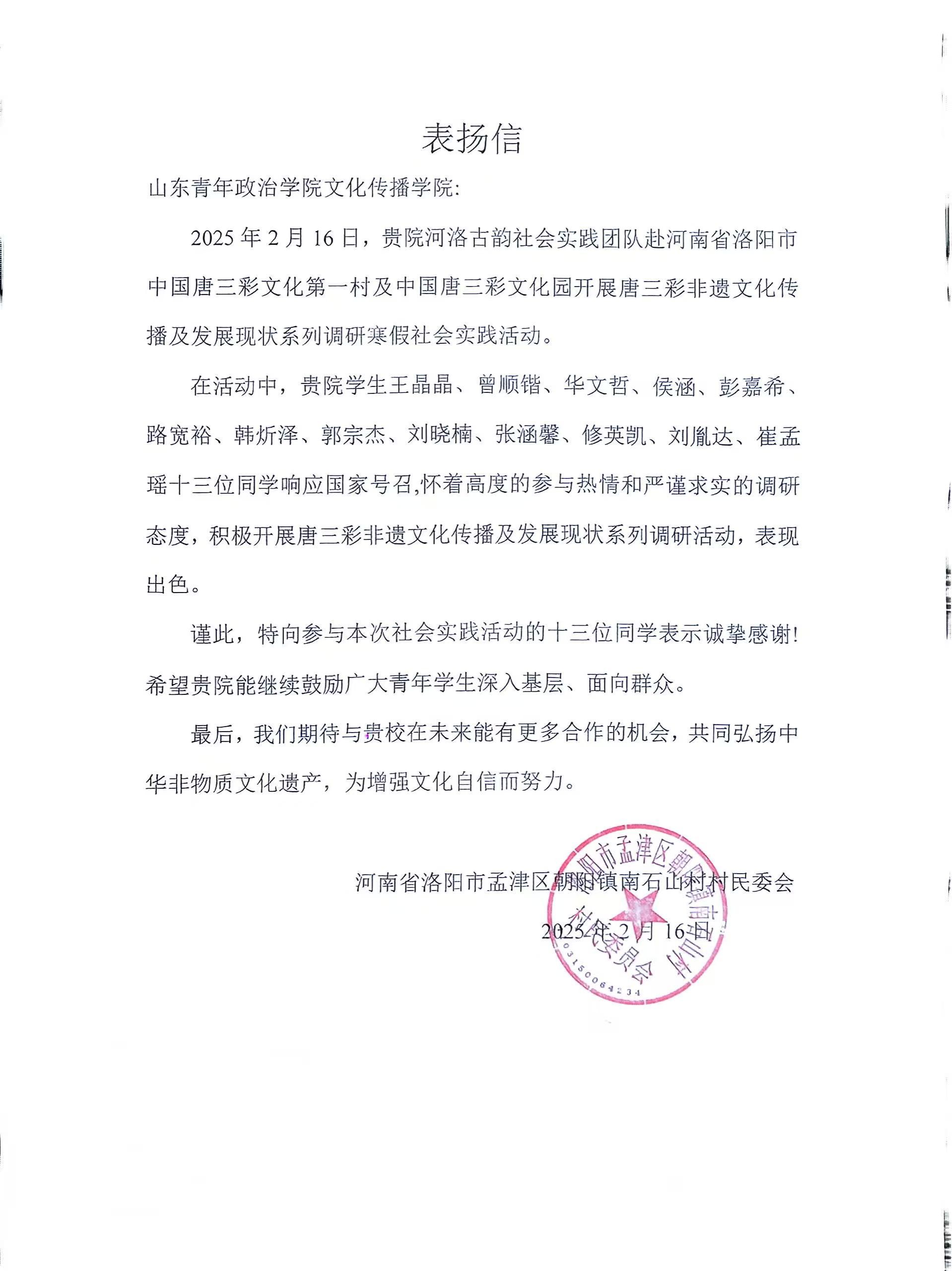 近日,河南省洛阳南石山中国三彩第一村向文化传播学院河洛古韵社会实践团队发来表扬信,对王晶晶、曾顺锴、华文哲、侯涵、彭嘉希、路宽裕、韩炘泽、郭宗杰、刘晓楠、张涵馨、修英凯、刘胤达、崔孟瑶13位同学在社会调研活动中的出色表现给予高度认可与赞扬。