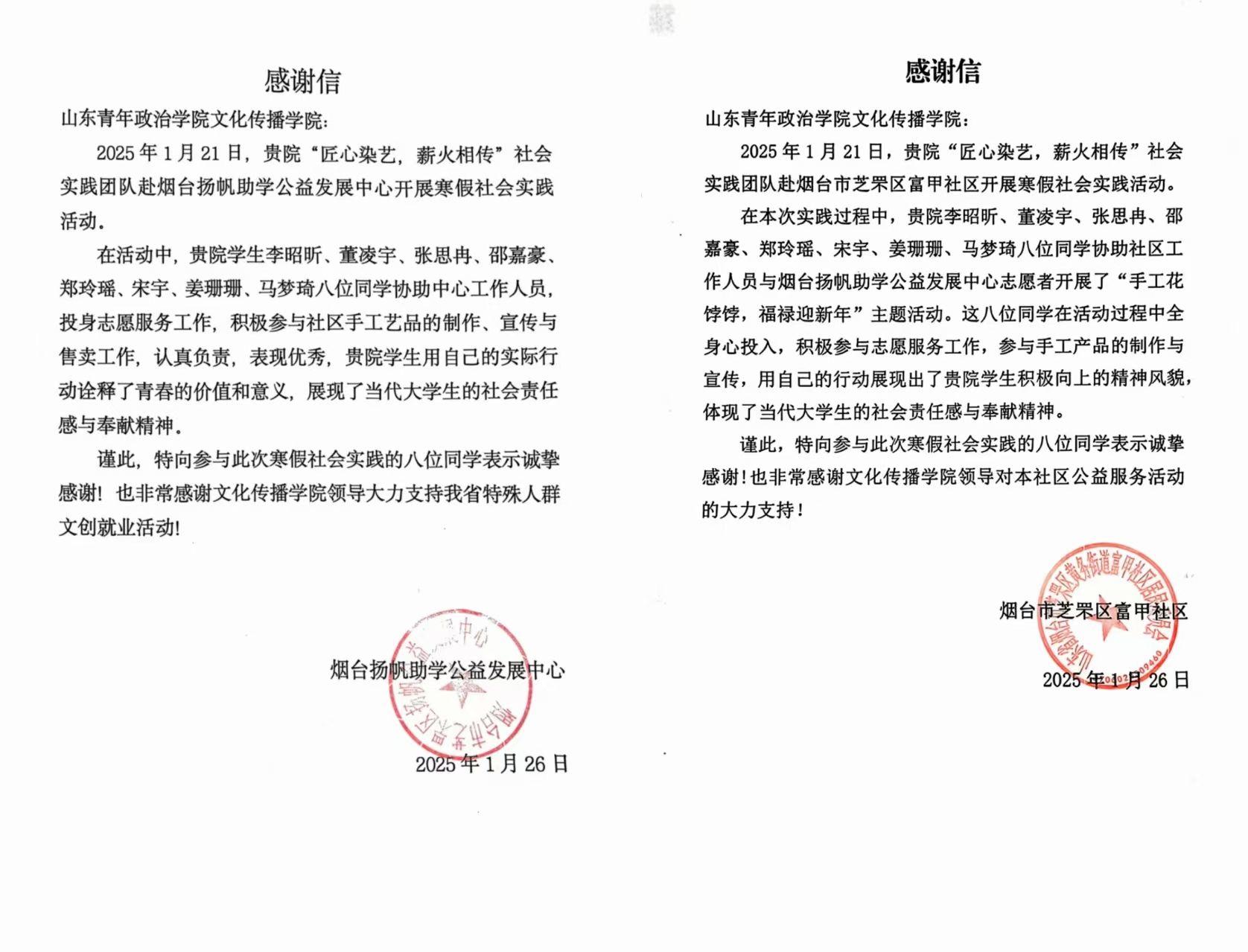 近日,烟台扬帆助学发展中心、烟台芝罘区富甲社区向我校文化传播学院发来感谢信,对学院李昭昕、董凌宇、邵佳豪、张思冉、郑玲瑶、宋宇、姜珊珊、马梦琦八位学生的寒假社会实践志愿服务工作给予了高度评价。